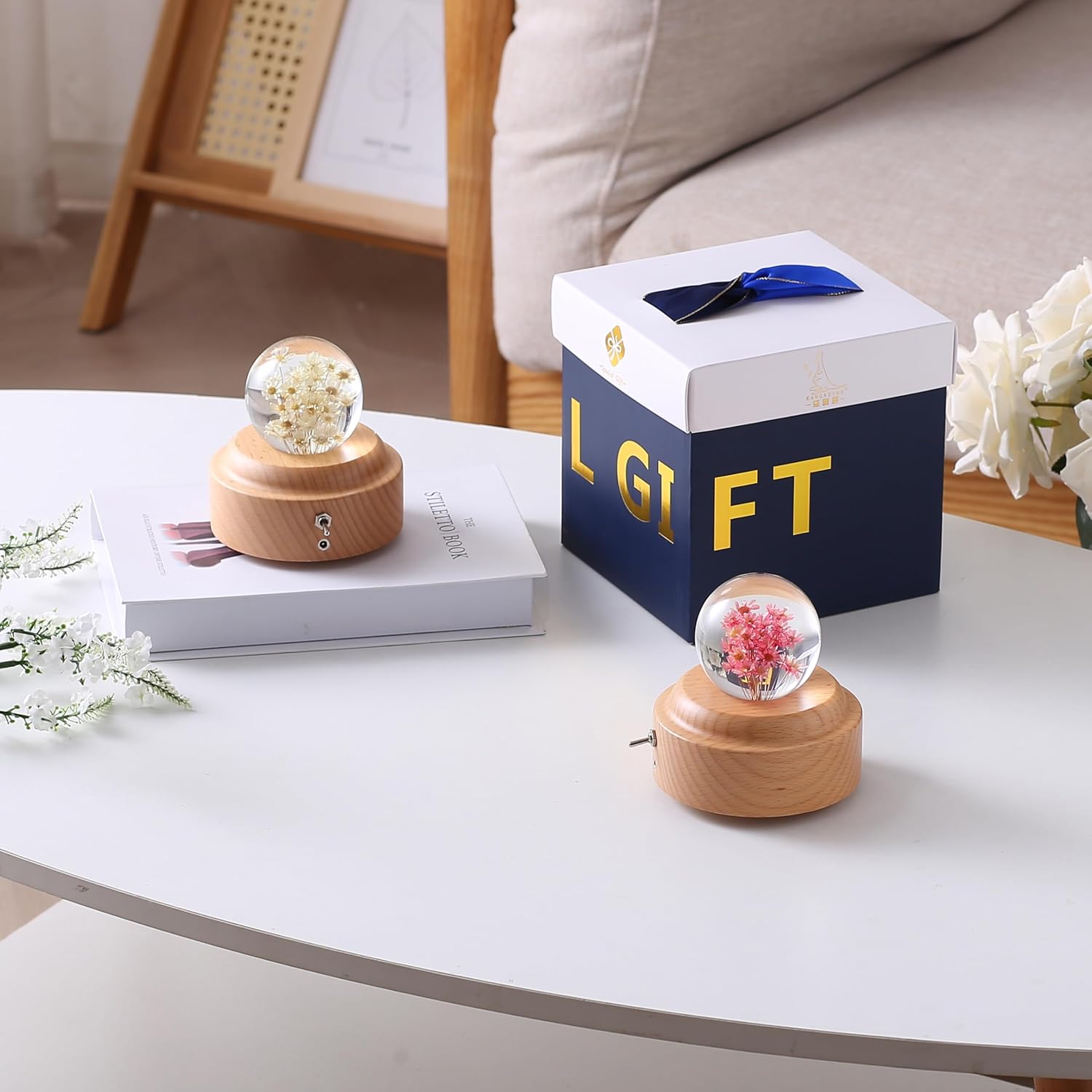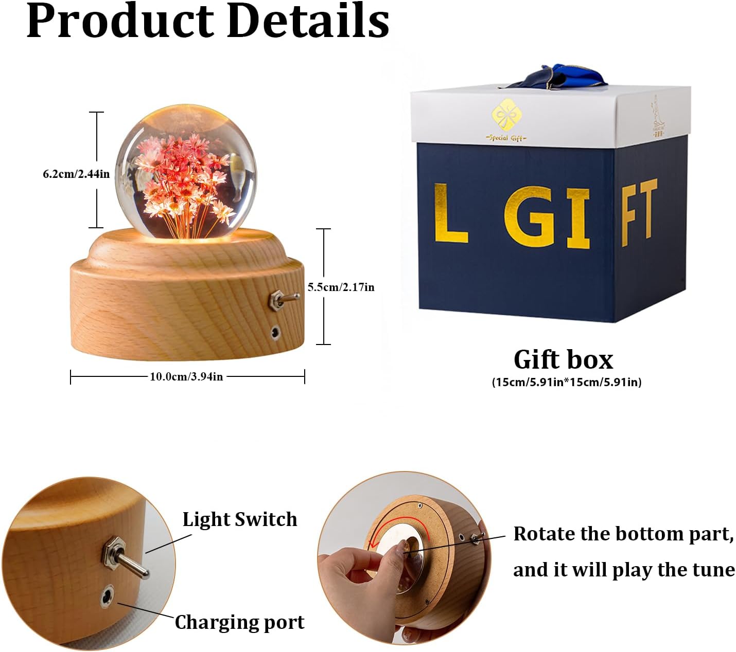 Romantic Design: This music box features a beautiful glass Red little daisy crystal ball night light, creating a romantic and enchanting ambiance.