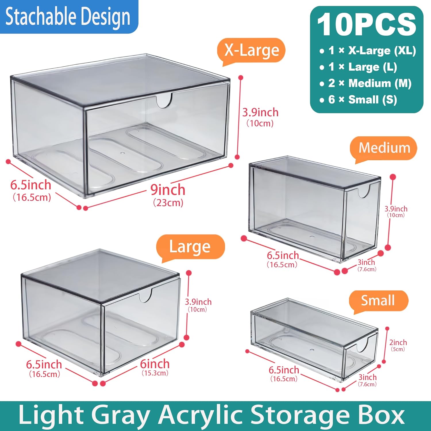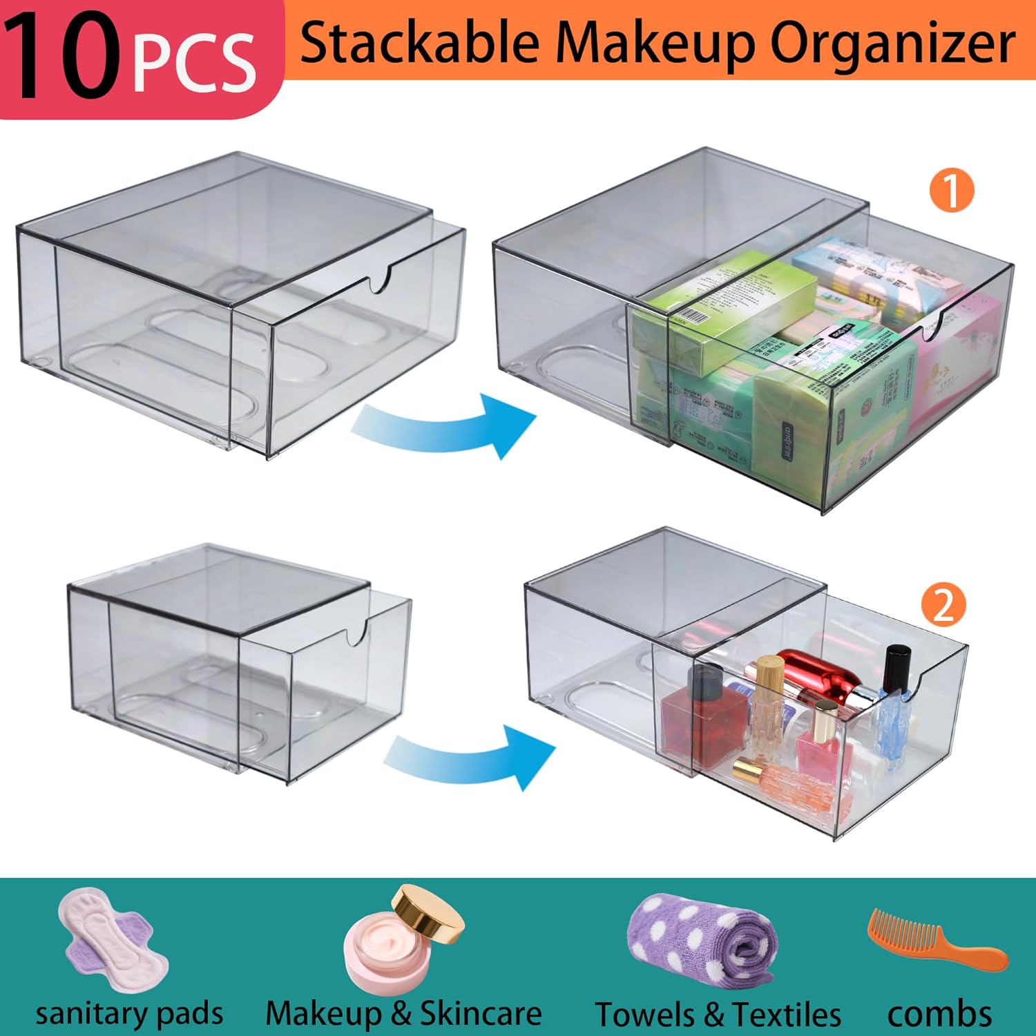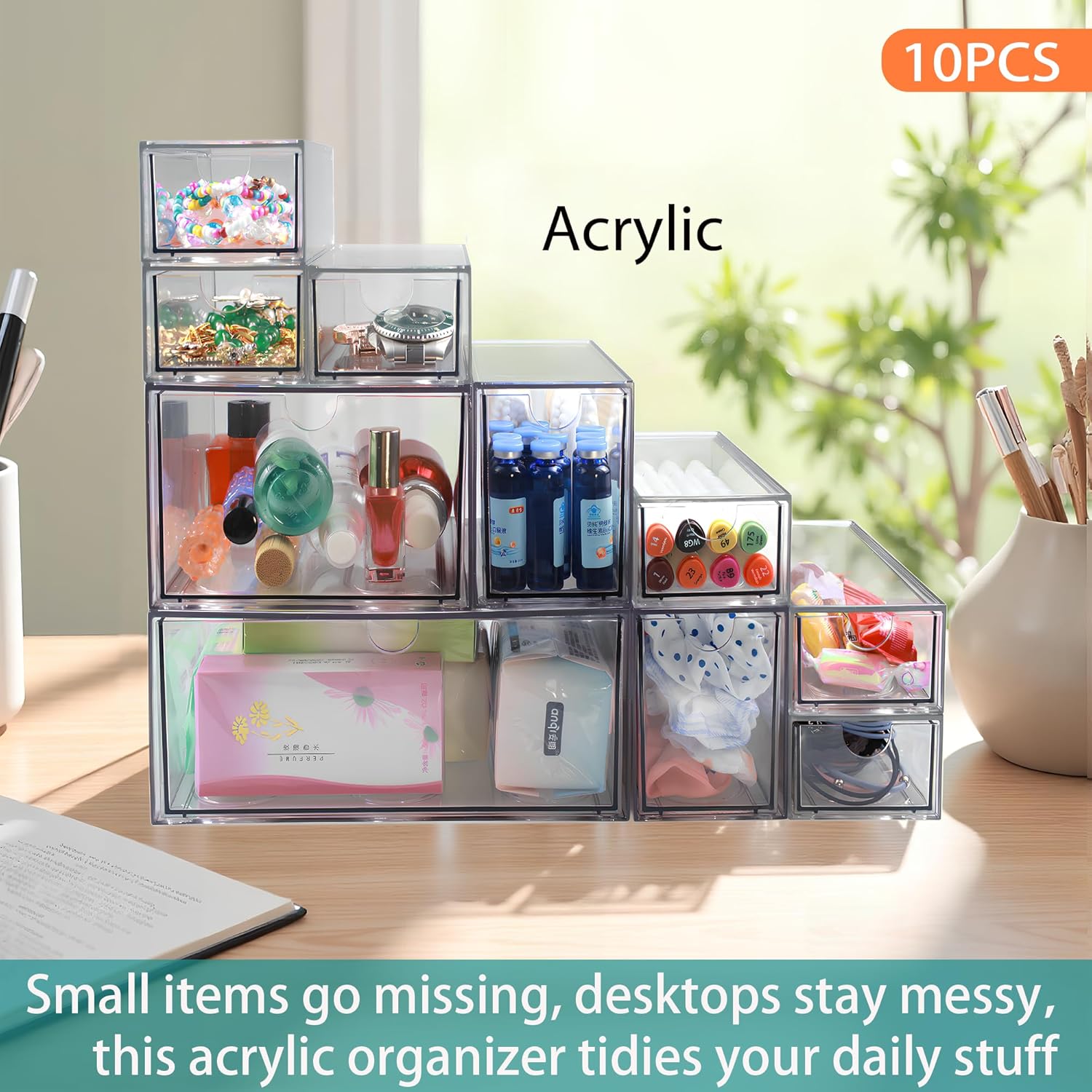 10 Pack Acrylic Makeup Organizer Clear Stackable Desk Organizers Dustproof Drawer for Make Up,Jewelry,Pen, Stationary