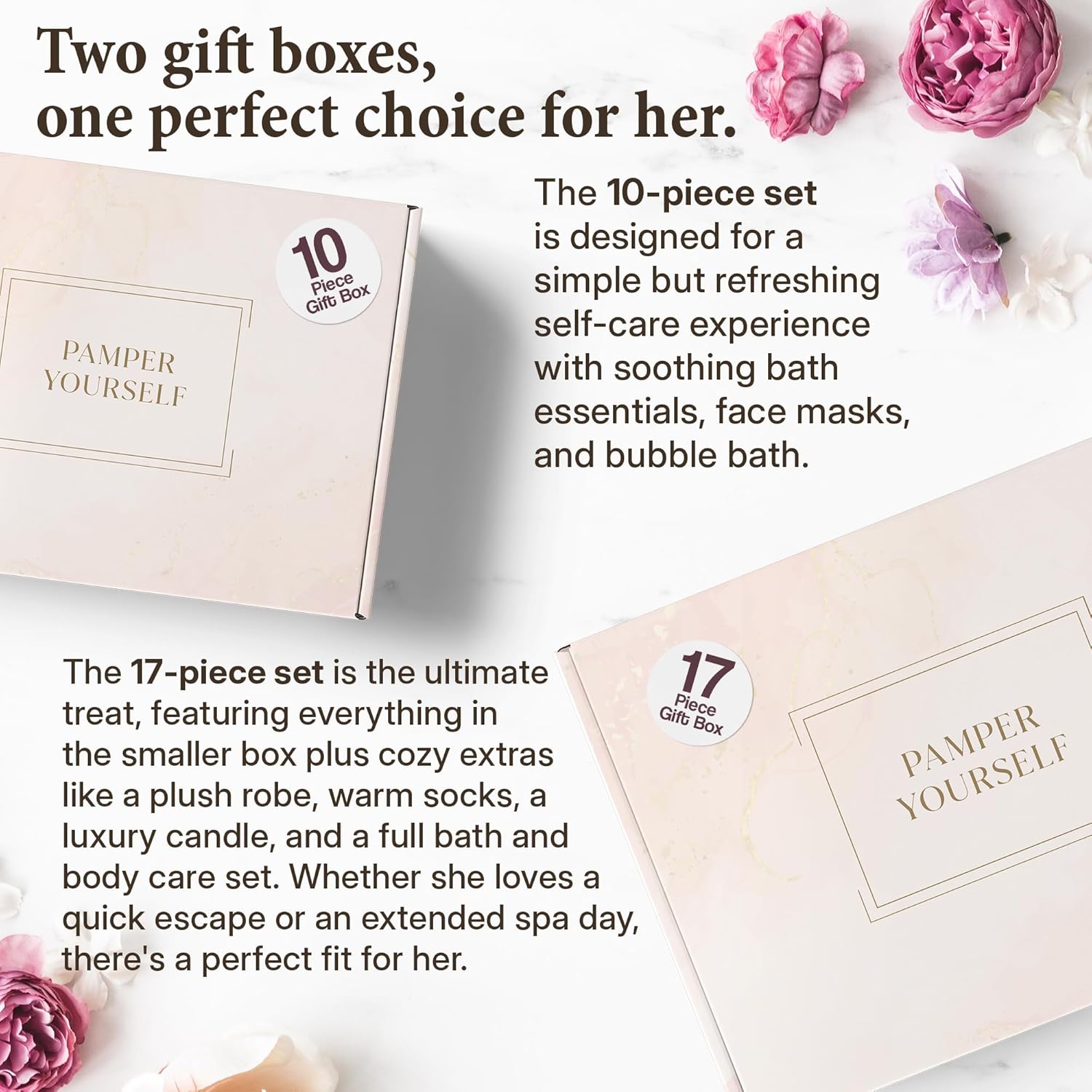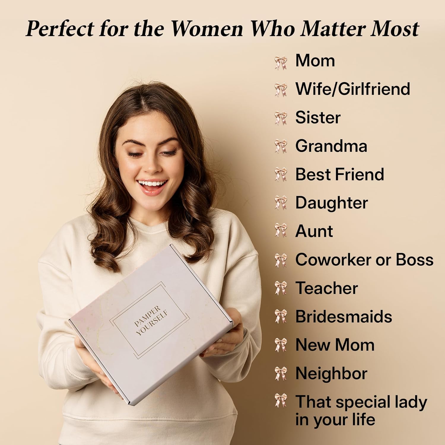 PERFECT GIFT FOR EVERY OCCASION: Thoughtfully curated for every special moment, this spa gift box celebrates moms, grandmas, mother-in-laws, wives, sisters, teachers & best friends. Making it perfect for birthdays, mother's day, valentines, anniversaries or "just because." Offering a unique & versatile way to show appreciation. From a busy professional to a friend needing a boost, this set is a top gifts choice for women, mothers, and loved ones. It’s a delightful way to make her feel cherished.