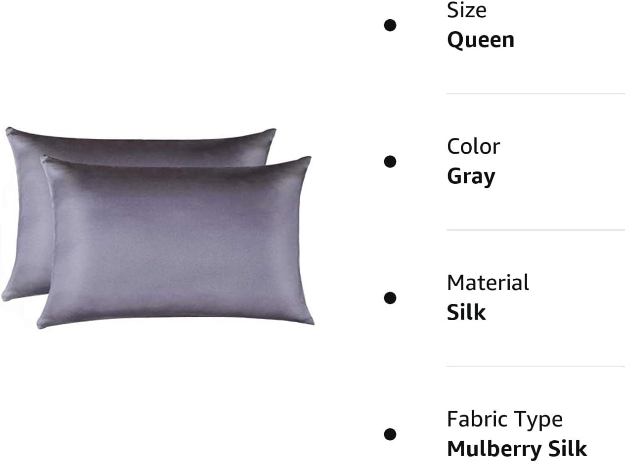 100% Mulberry Silk Pillowcases Set of 2 for Hair and Skin and Super Soft and Breathable Queen Size Nature Silk Pillowcases (Queen, Gray)