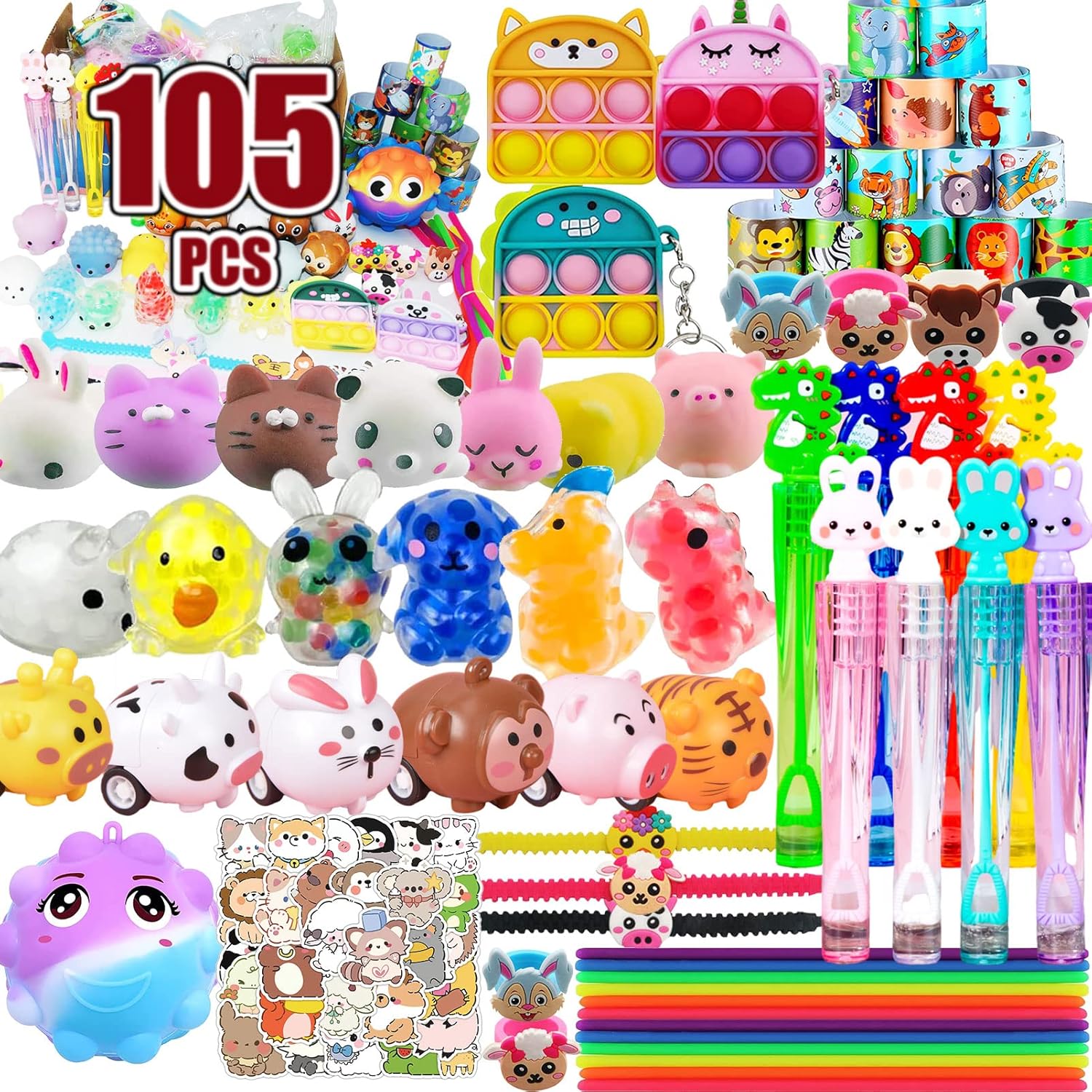 Assortment Premium party favors for kids: Look no further! Our assortment premium party toy bundle includes 6 cute mini bubble wands, 4 pop fidget it keychains,2 cute pop fidget it keychains,1 ctue pop it ball, 6 mochi squishies, 4 squishy squeeze animals,10 mini stretchy strings, 2 cute animal bracelets, 4 animal cars, 2 cute animal ring, 6 Cute Animal Slap and 60 animal stickers, for a total of 105 pieces. Each toy has been carefully selected to ensure that it is both fun and engaging for kids