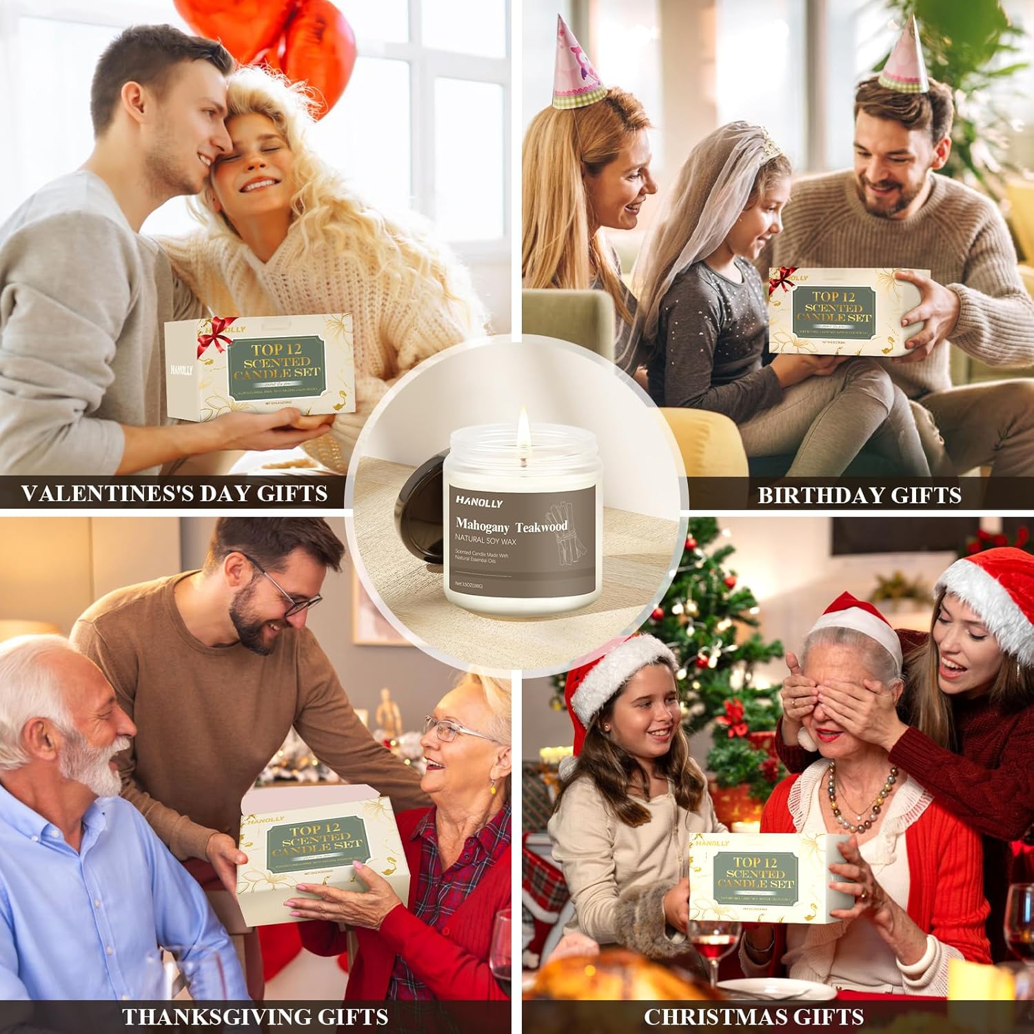 12 Pack Natural Scented Candles:Discover luxury home scents with our curated collection: Sage & Citrus, Sicilian Lemon, Lavender & Oak, Fresh Cut Roses, White Gardenia, Balsam & Cedar, Jasmine Oud & Sandalwood, Vanilla Bean, Saltwater Lotus, Eucalyptus & Mint, Mahogany Teakwood, and Lilac Blossoms candle. Perfect aromatherapy candles to uplift, relax, or refresh any space.