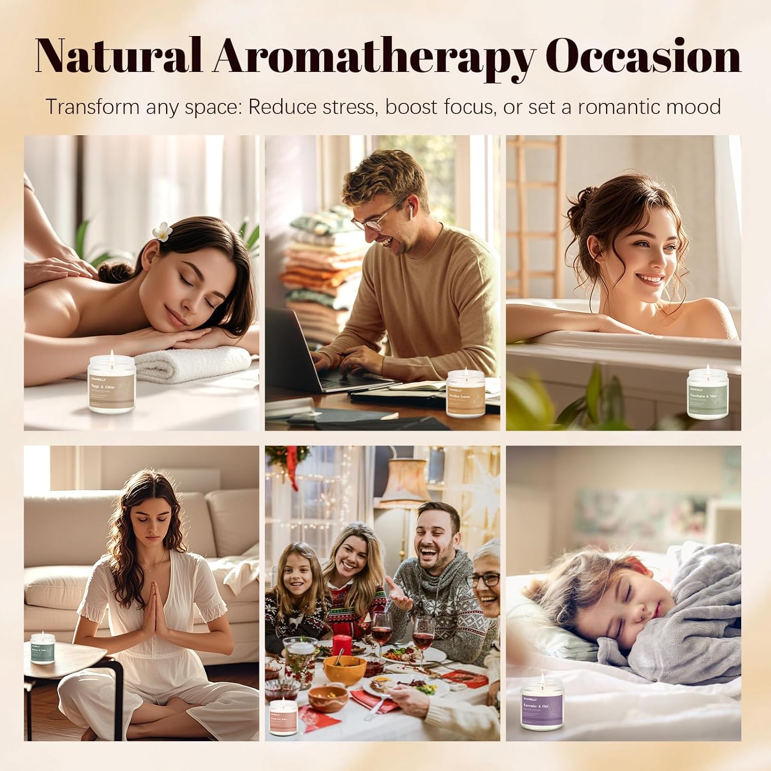Long Lasting Burn:Crafted with 100% natural soy wax candles non toxic, these aromatherapy candles offer a cleaner, longer-lasting burn than paraffin alternatives. Our soy candle blend ensures minimal soot and even wax pooling for up to 20 hours per candle. Infused with natural essential oils, they provide exceptional scent throw—ideal for creating a wonderful home fragranc.