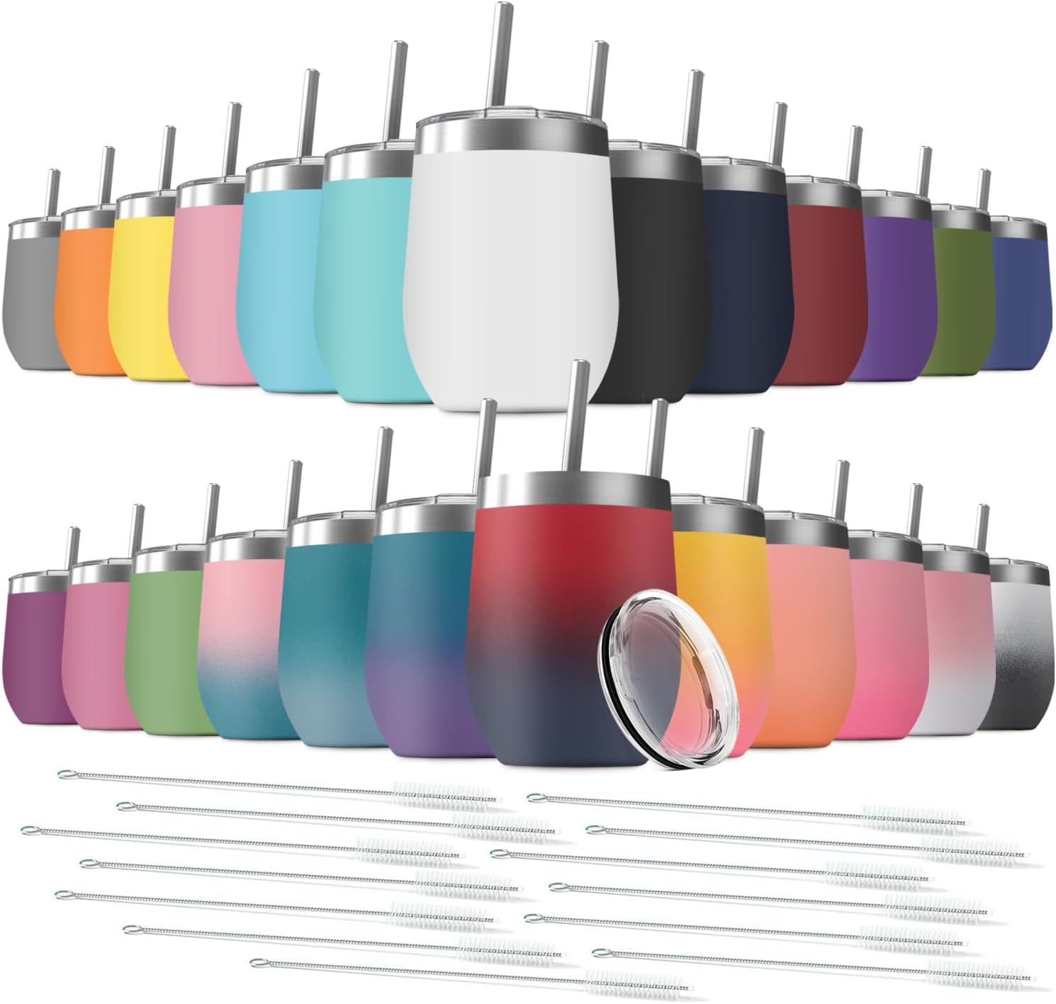 12oz Wine Tumbler with Lid With straw Stainless Steel Wine Tumbler Cups Double Wall Vacuum Insulated Travel Mugs Stemless Cup 25 Pack