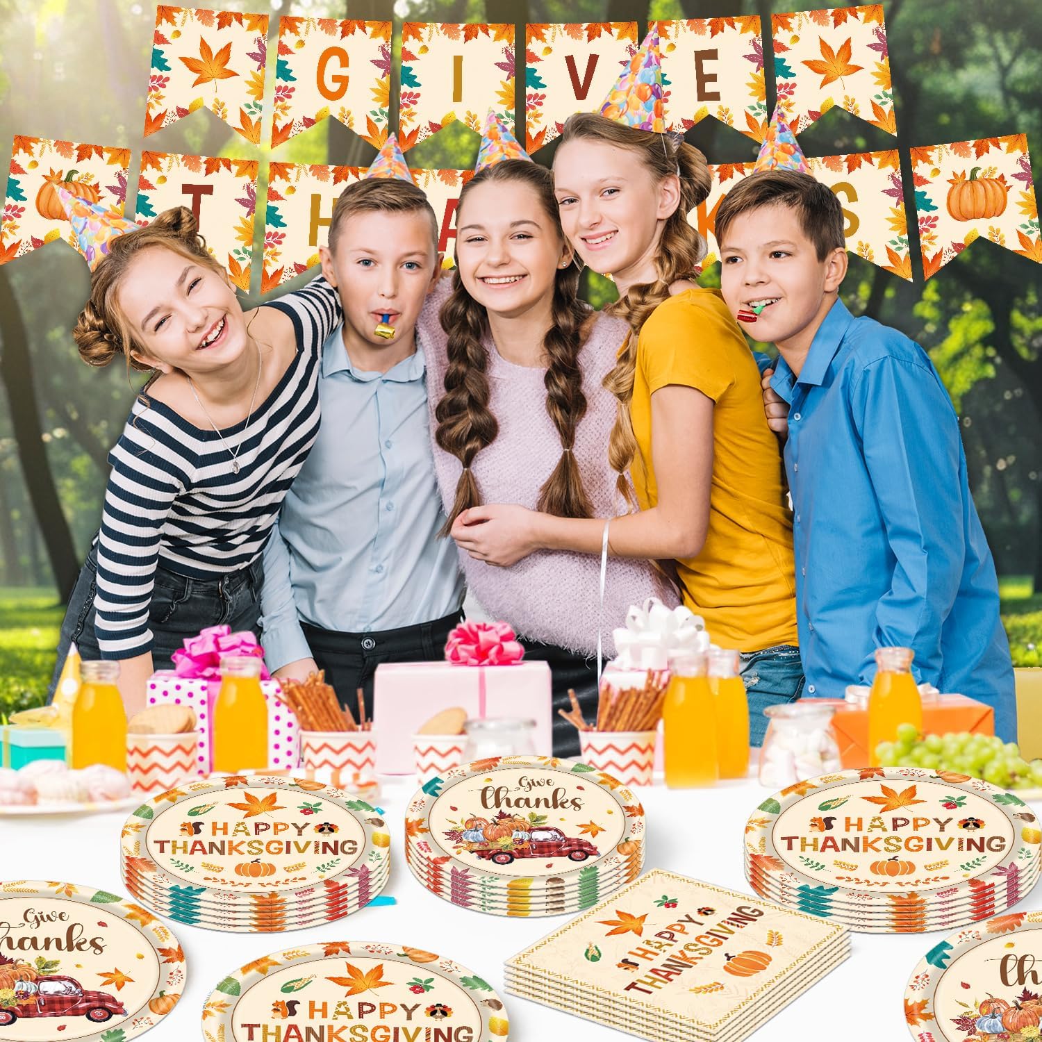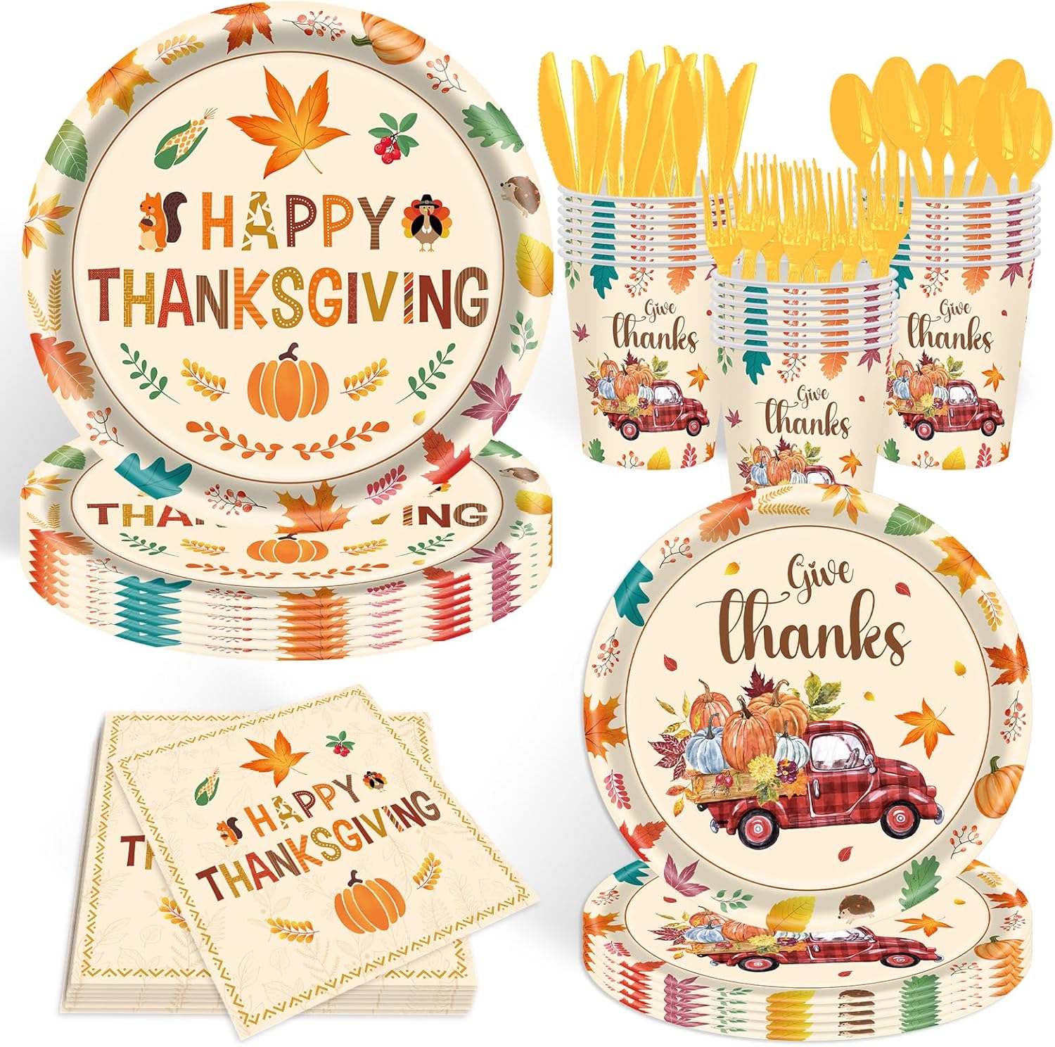 Happy Thanksgiving Party Supplies: Fancy thanksgiving plates are decorated with pumpkins, leaves, turkeys and small animals. It will glam up any party table, adding an elegant, fancy touch to your party. Every guest will love the beautiful fall party supplies set! Perfect for any fall themed party