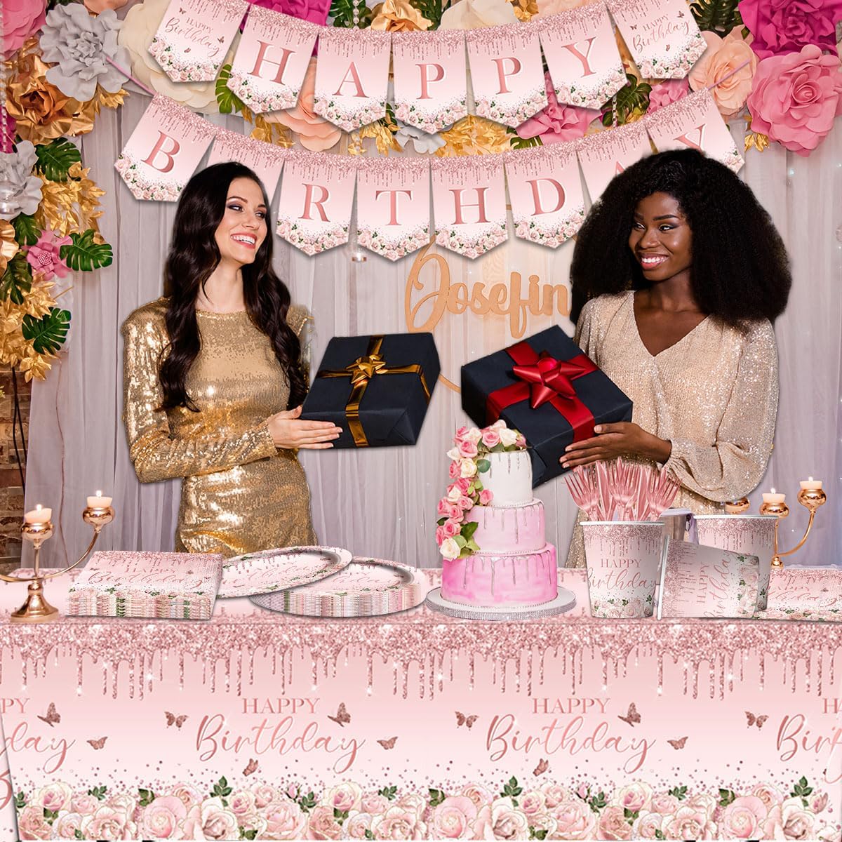 142Pcs Pink Rose Gold Birthday Party Supplies - Pink Birthday Party Tableware Disposable Dinner Plate,Tablecloth Rose Gold Theme Birthday Party Decoration for 50th 60th 70th 80th Women or Girls