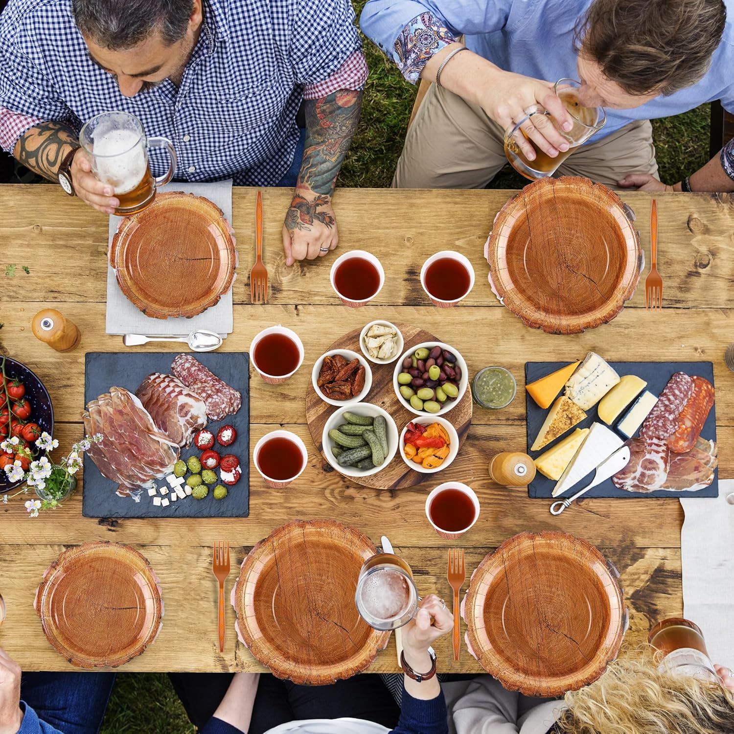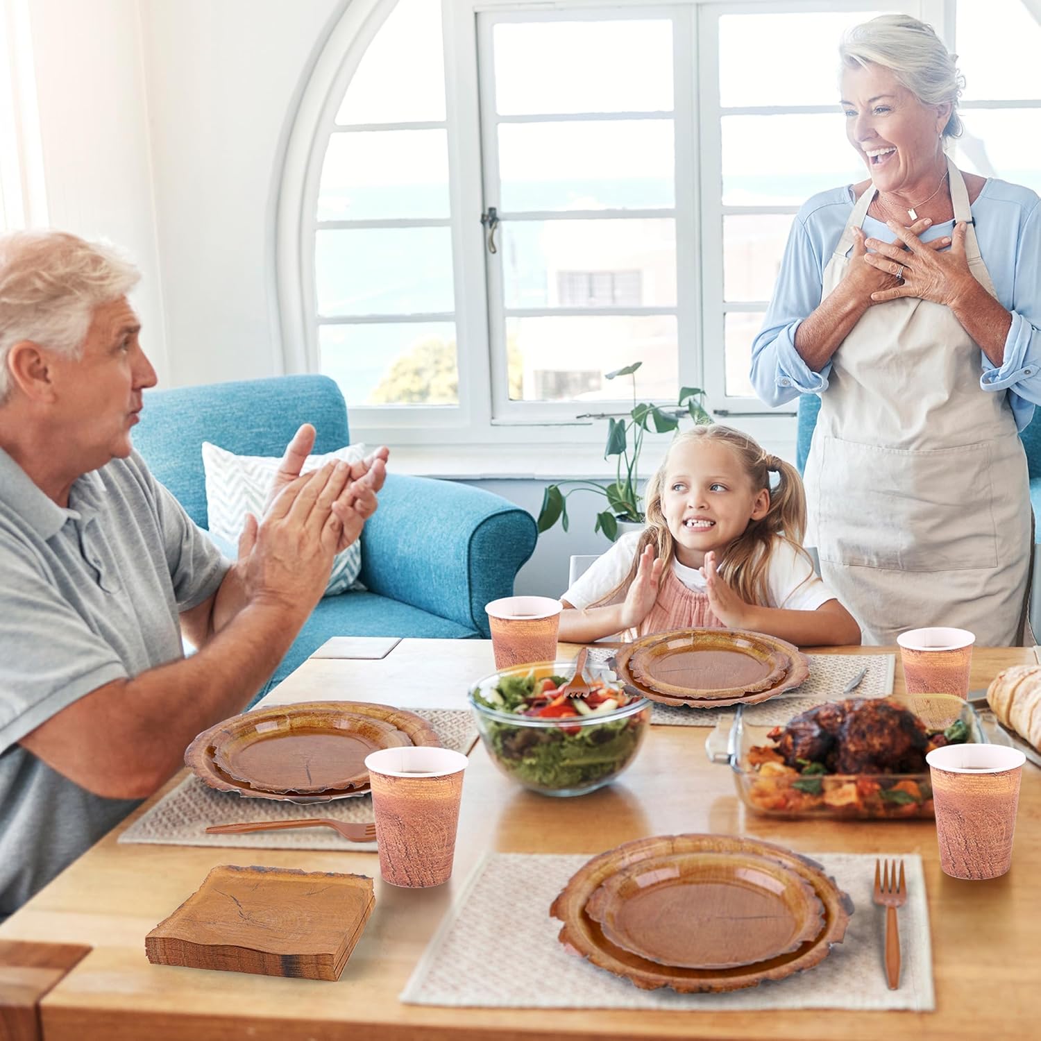 Package includes: our camping wood grain slice tableware sets include 24 pieces of 9-inch/22 cm plates, 24 pieces of 7-inch/17 cm plates, 24 pieces of 9-ounce cups, 48 napkins with a folded size of 6.5 inches x 6.5 inches/16.5 x 16.5 cm, and 24 brown plastic forks, totaling 144 pieces; the nice combination and sufficient quantity can meet your party and daily needs