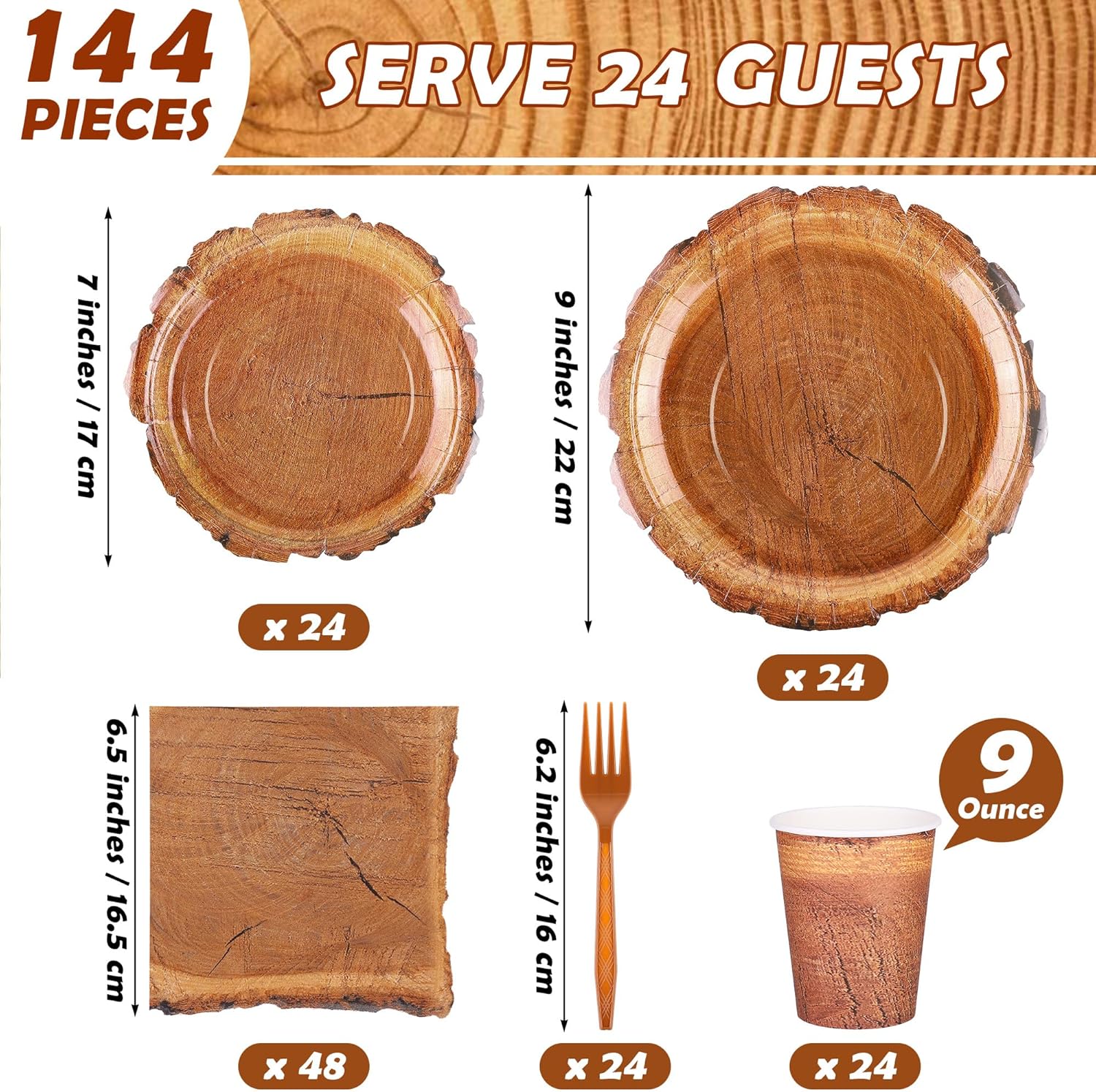 144 Pieces Camping Wood Grain Slice Tableware Sets Rustic Wood Party Decorations Paper Plates Napkins Cups Forks Serves 24 for Forest Themed Party Decorations Hunting Birthday Supplies