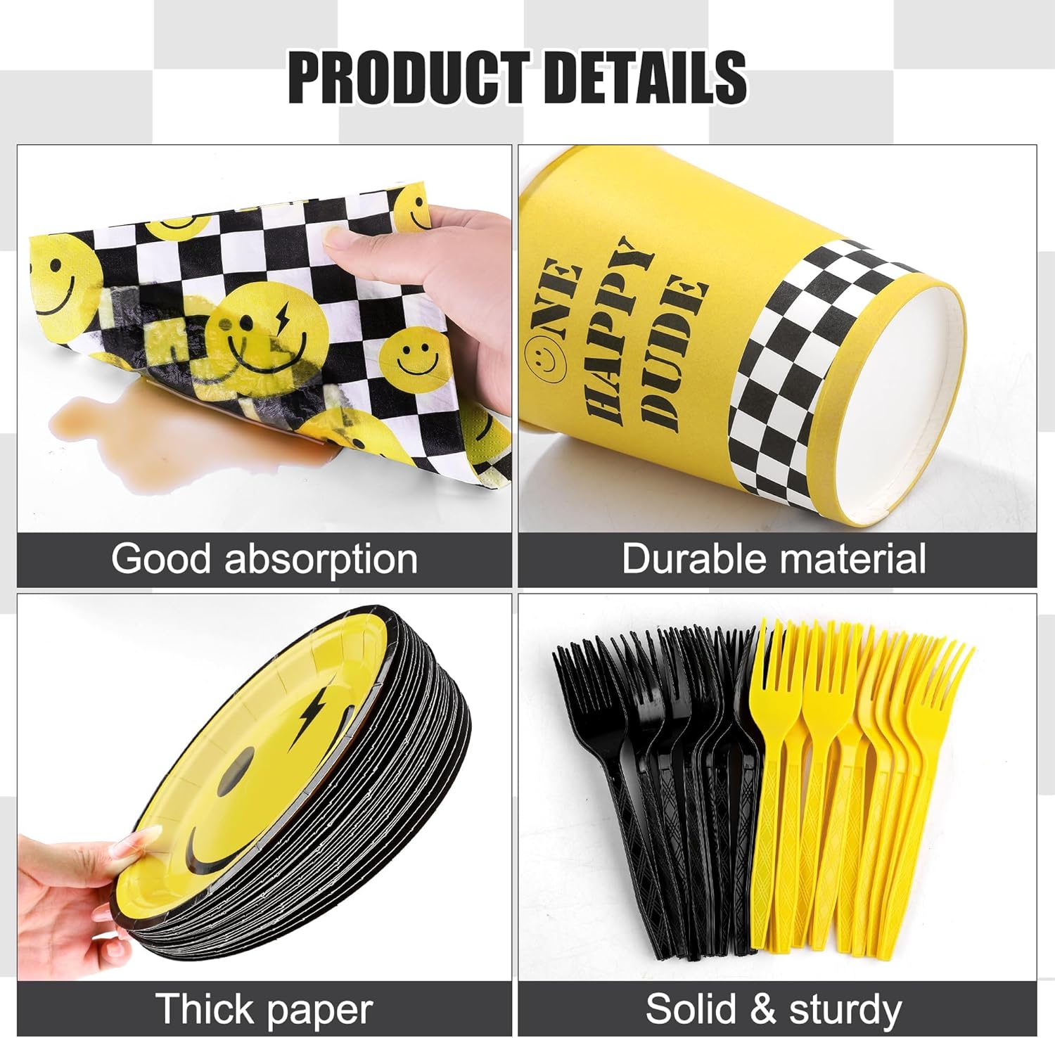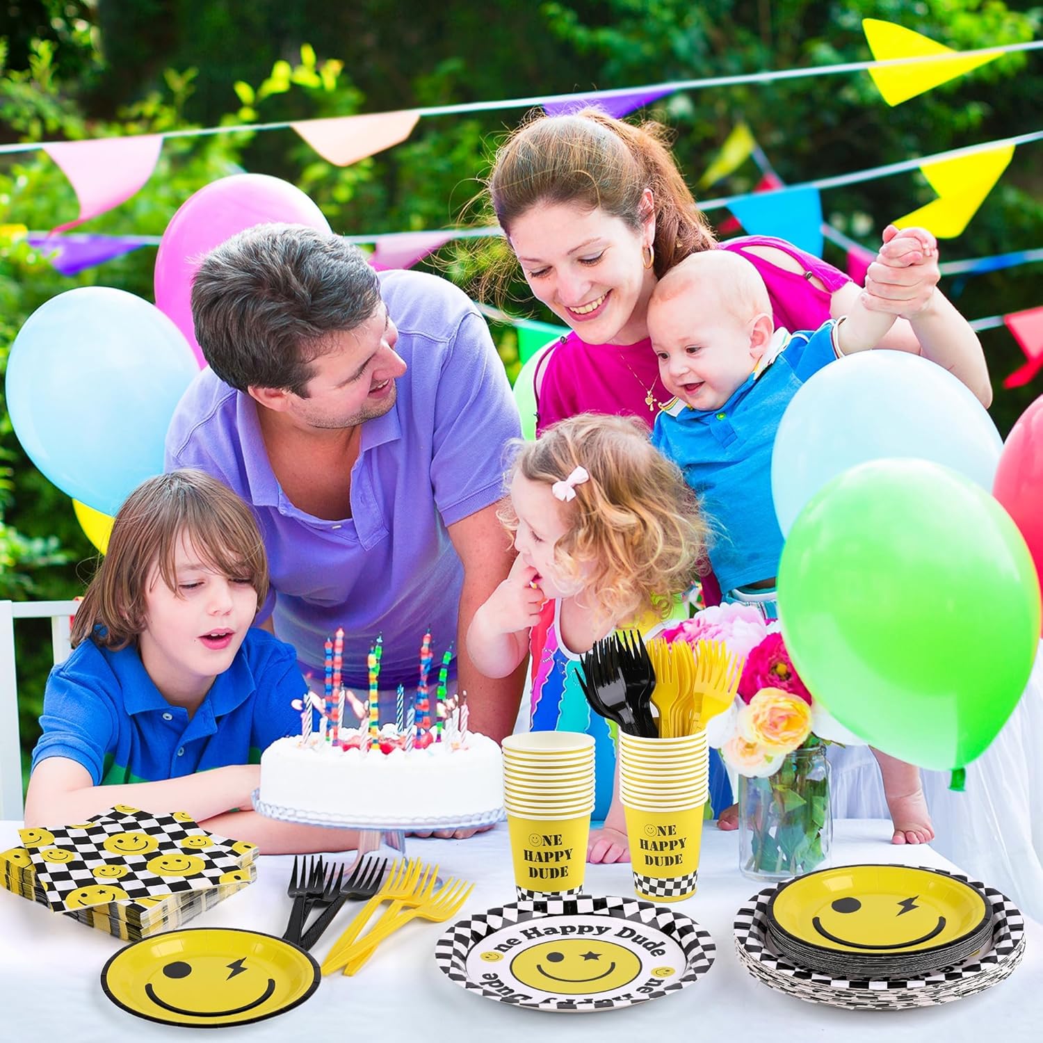 144 Pieces One Happy Dude Party Tableware Sets including Disposable Plates Napkins Cups Forks Serves 24 for Smiley Face 1st Birthday Preppy Party Decorations