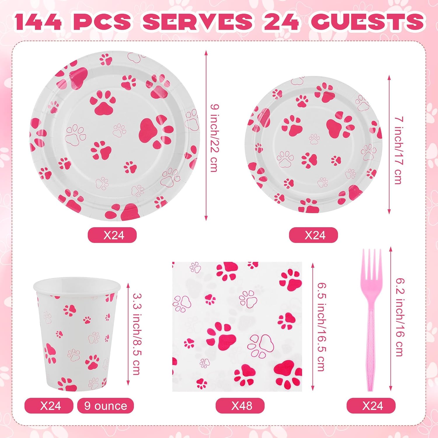 144 Pieces Pink Paw Print Party Tableware Sets Including Disposable Plates Napkins Cups Forks Serves 24 for Dog Puppy Theme Party Supplies