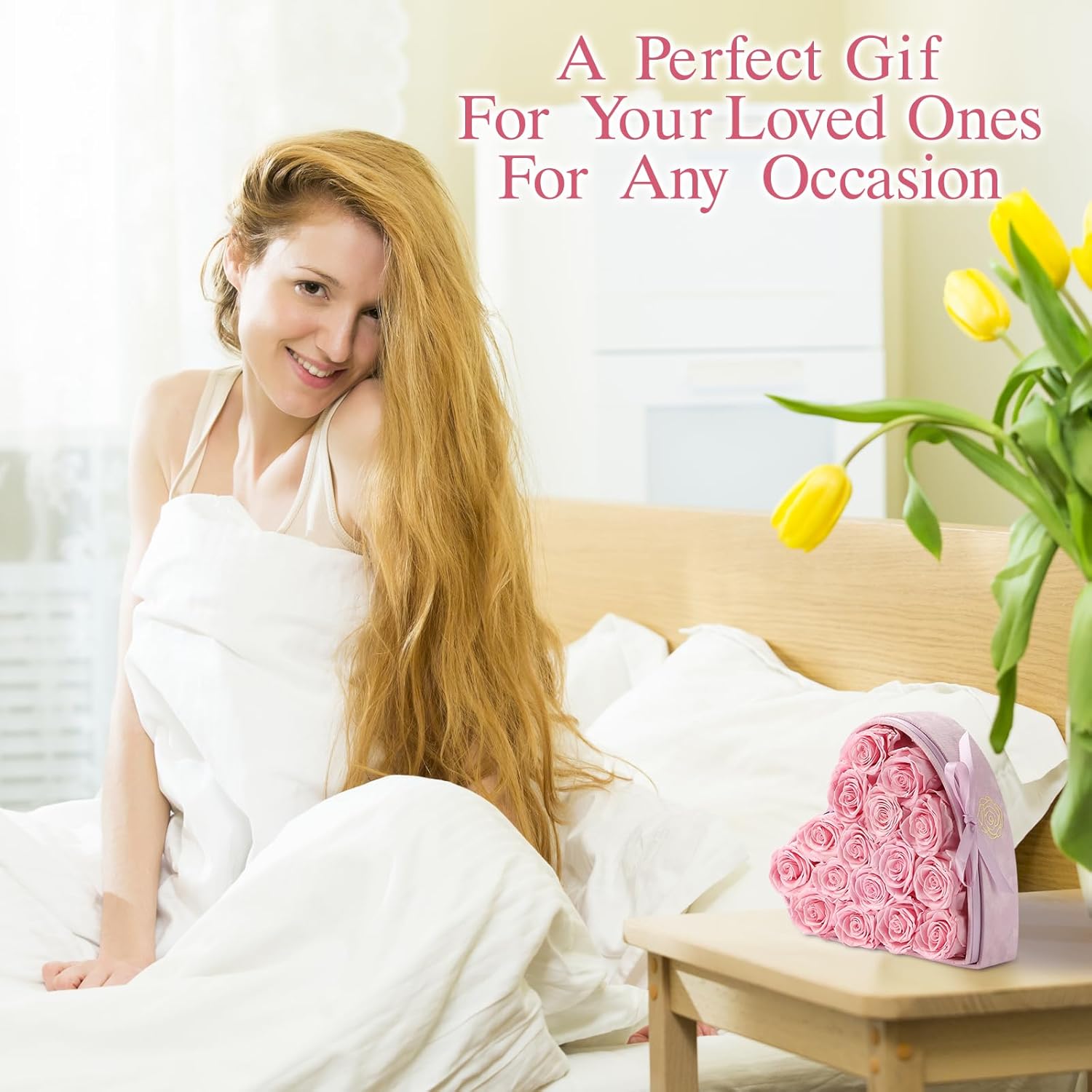 16 Forever Flowers in Heart Shaped Box - Preserved Roses Romantic Gifts for Her, Valentine’s Day, Anniversary, Wedding (Pink)