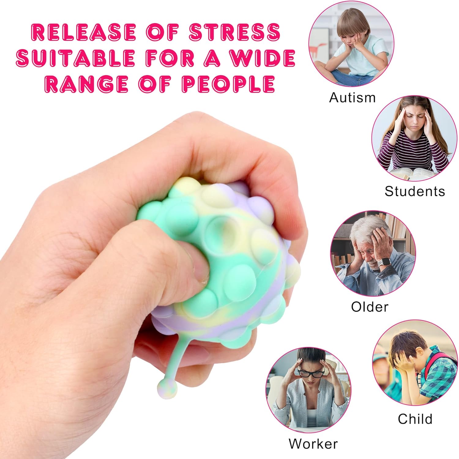 đăStress relief toysăWhen press the bubbles, the mini pop balls fidget toy will make a slight popping sound, itâs very enjoyable and decompressedďźWhether you want to naturally relieve accumulated stress or anxiety caused by work overload, school or personal issues or you simply want to surprise your little one with a fun, entertaining toy that will keep them engaged for hours, this pop fidget ball sensory toy is the perfect solution!