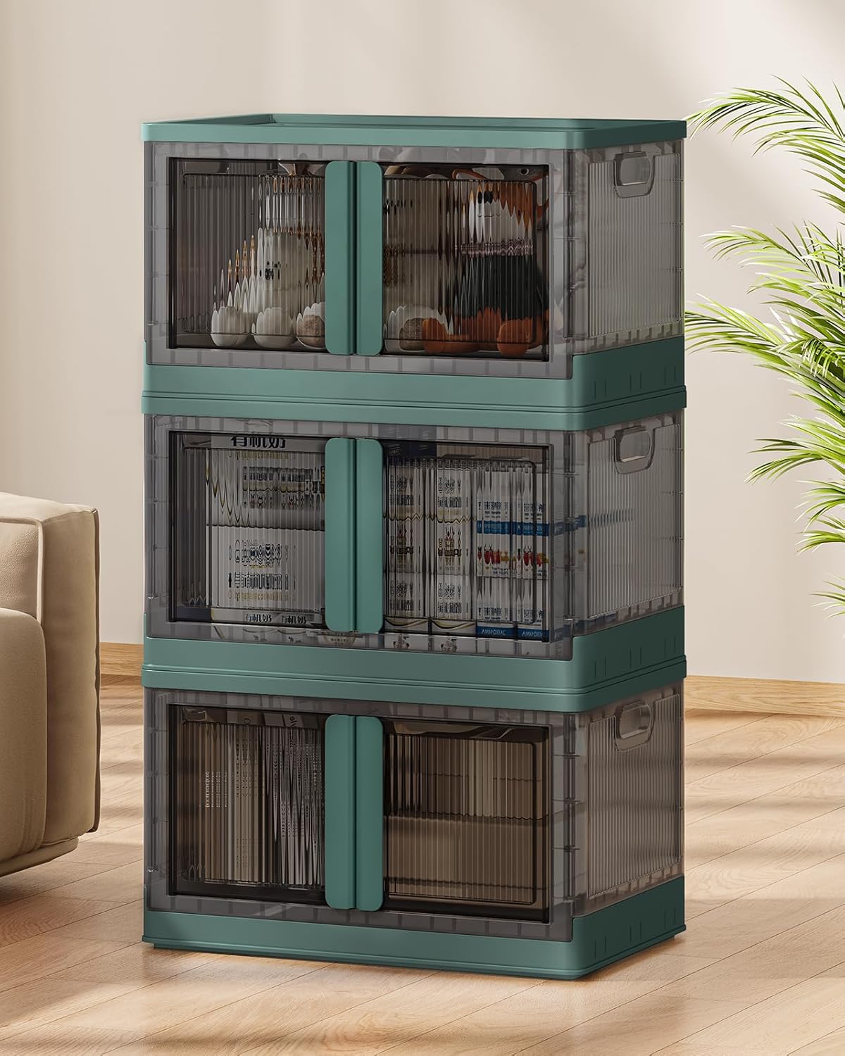 19Gal Collapsible Storage Bins with Lids & Wheels - 3 Pack Stackable with Doors, Heavy-Duty Plastic Containers for Home/Office, Green