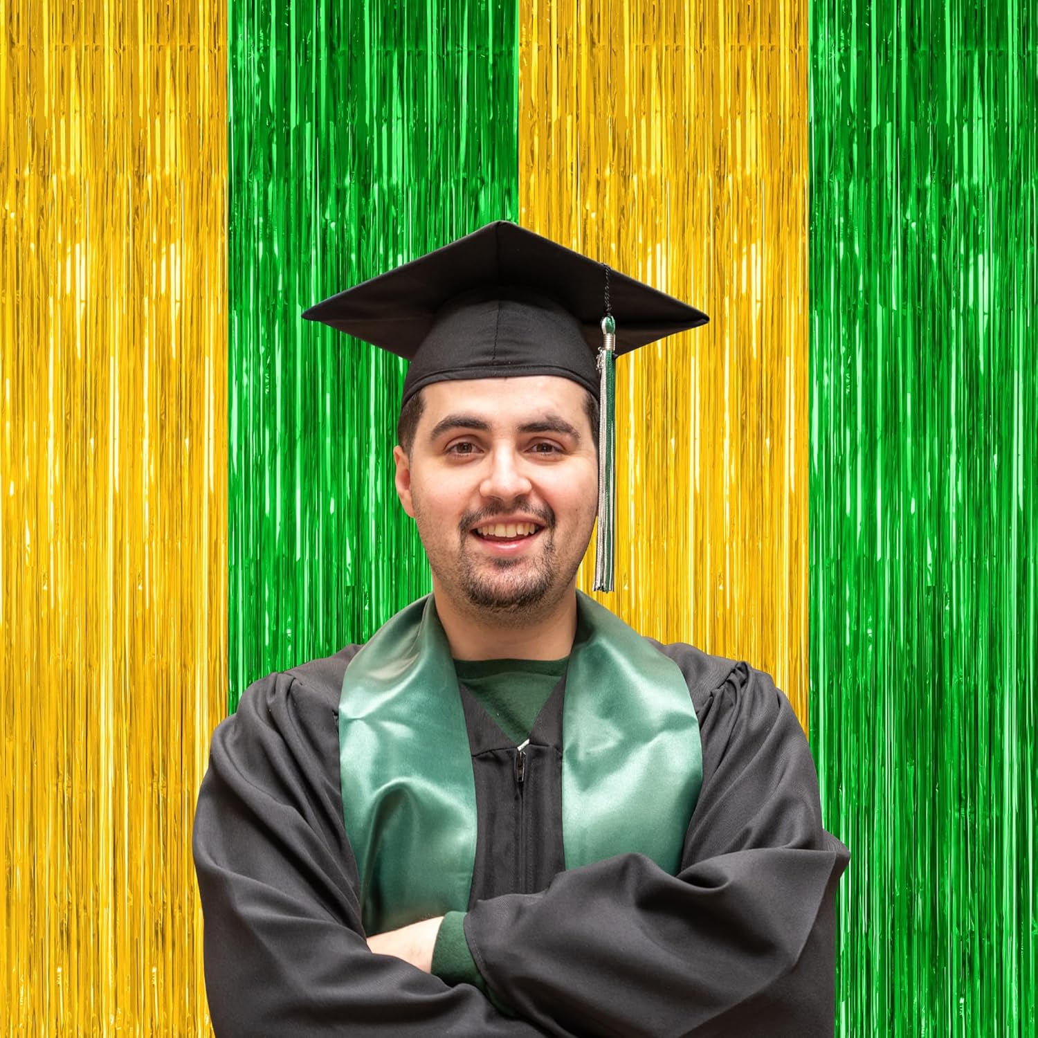 2 Pack Graduation Backdrop, Large Grad Decor 2025, Green Gold Graduation Photo Backdrop Fringe Curtains Party Streamer, Metallic Green and Gold Grad Decorations Class of 2025