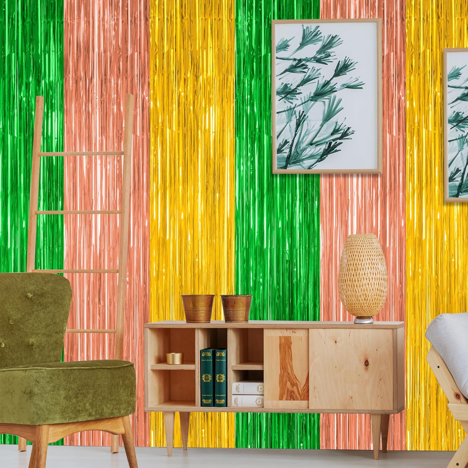 Hawaiian Design: The color combination of green, brown, and yellow reflects the energy and enthusiasm, and the metallic finish gives these green, brown, and yellow tassel curtains a vibrant look suitable for your Hawaiian party decor.