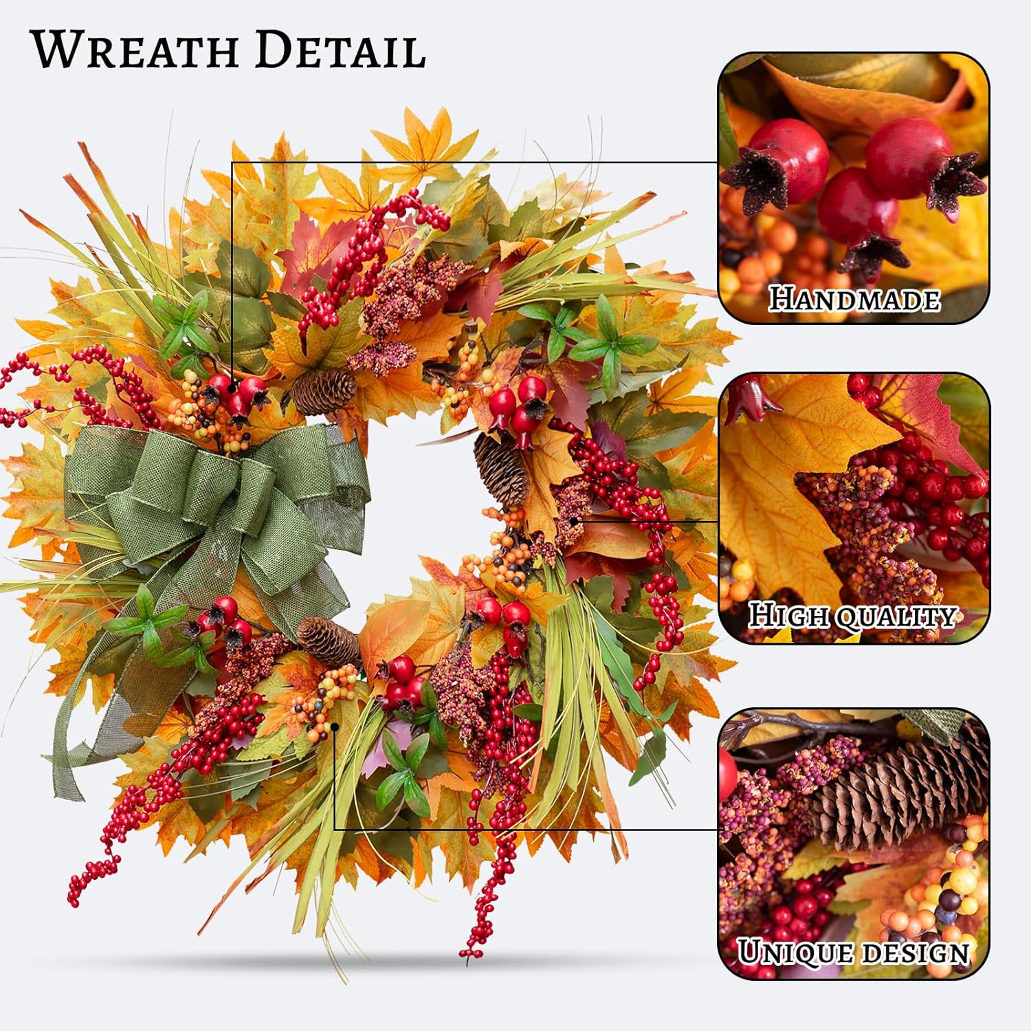 【Vibrant & Lifelike Fall Door Wreath】This 24 inch autumn wreaths for front door is filled with lifelike autumn leaves in warm tones, red berries, pine cones, and a charming green bow. It adds a stunning seasonal touch to your front door decor