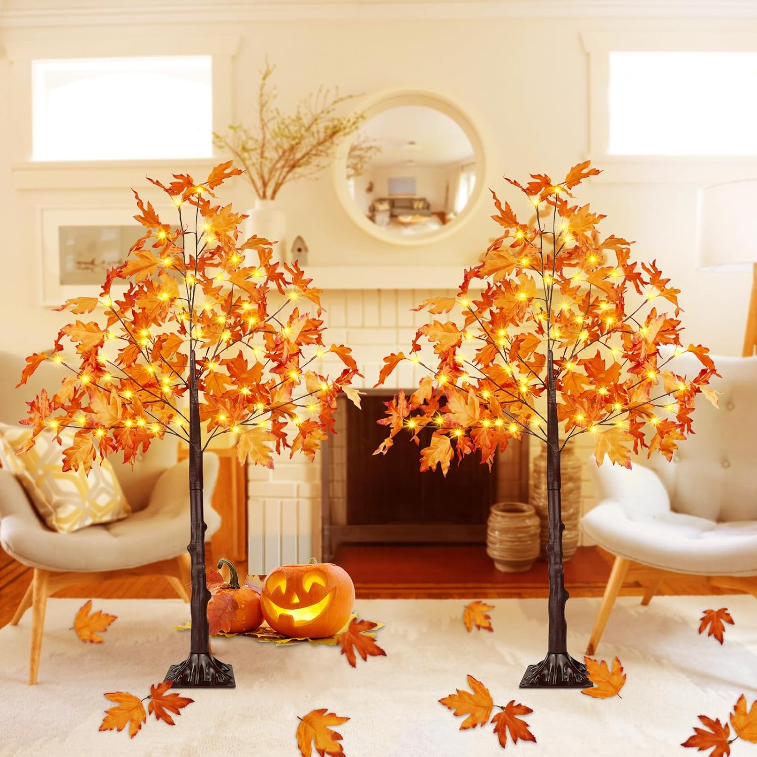 2025 Upgraded Fall Decor Maple Tree Lights: We designed the artificial tree lights in the style of maple tree lights. Total height of 4FT with a 6.7 in* 6.7 in base, total 100 LED warm white lights, lifelike shape, flexible branches, commonly use for autumn furniture decorations and create a cozy and warm atmosphere.
