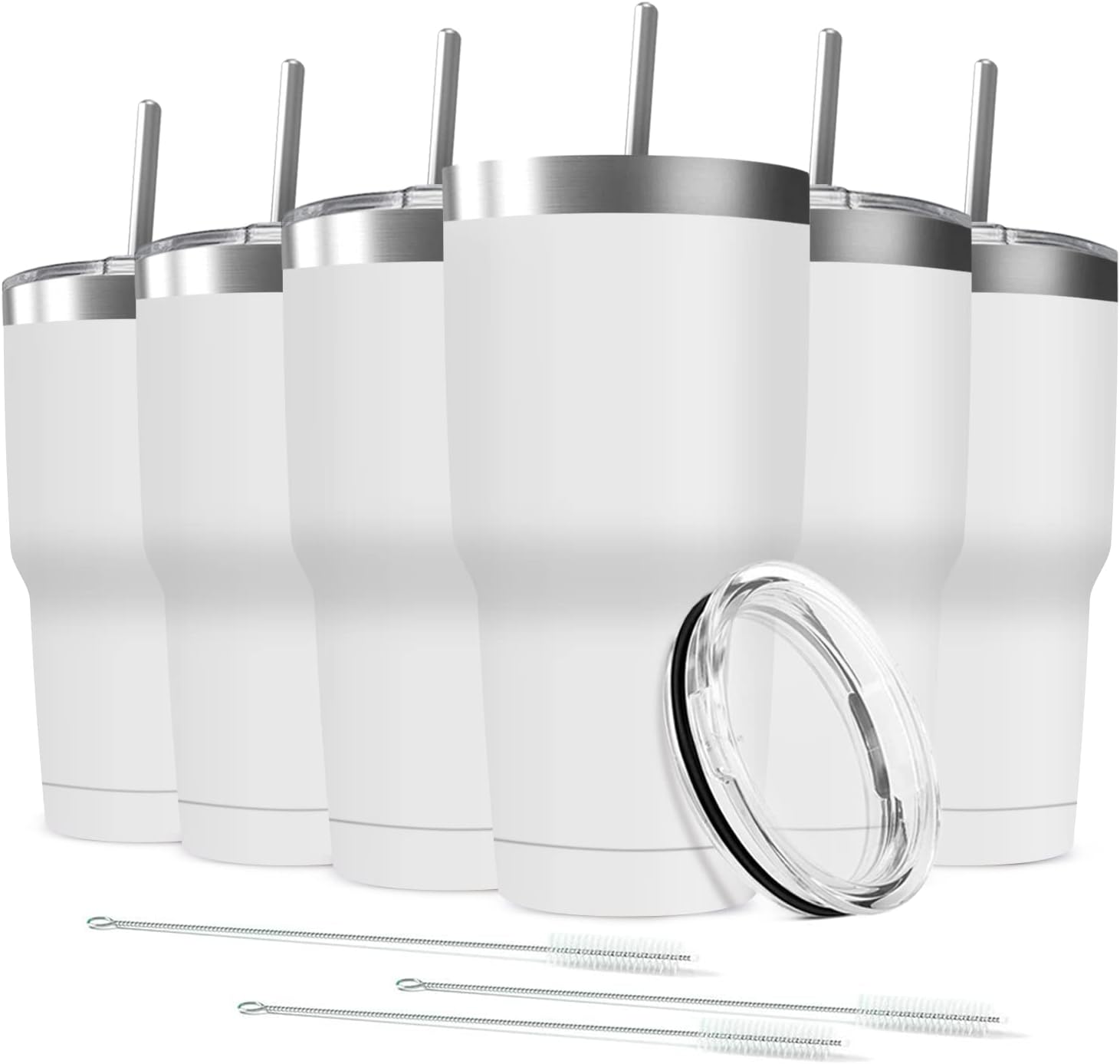 30oz Stainless Steel Travel Mug with Lid, 6 Pack Double Wall Vacuum Insulated Bulk Tumbler with 6 Straws, Powder Coated Coffee Cup Suitable for Vehicle Cup Holders(White)