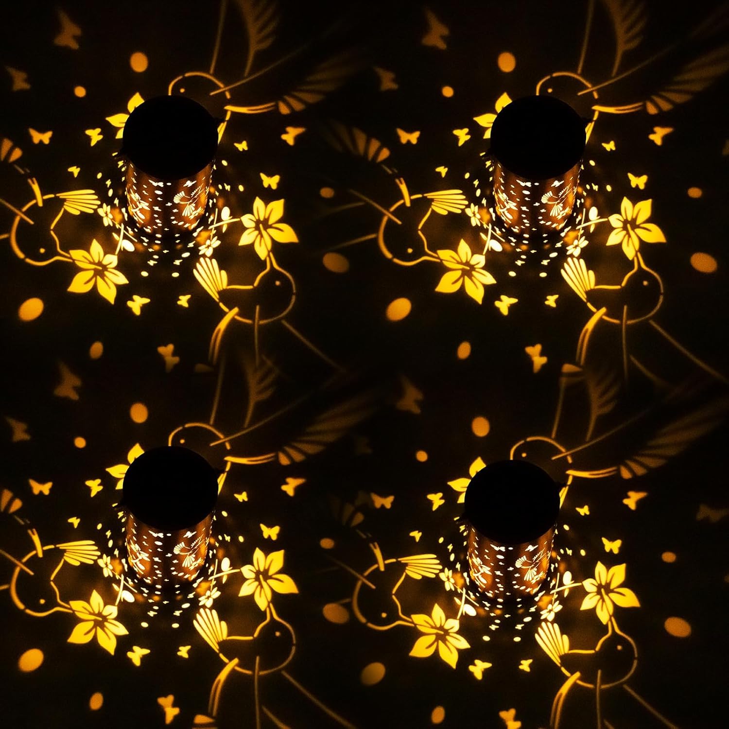 Gorgeous & imaginative Garden Decor - Fusion the retro gold, copper of exteriors and irregular pattern inside, at darkness, the solar lantern casting a bright, warm light with hummingbird patterns, which looks like they are real and flying