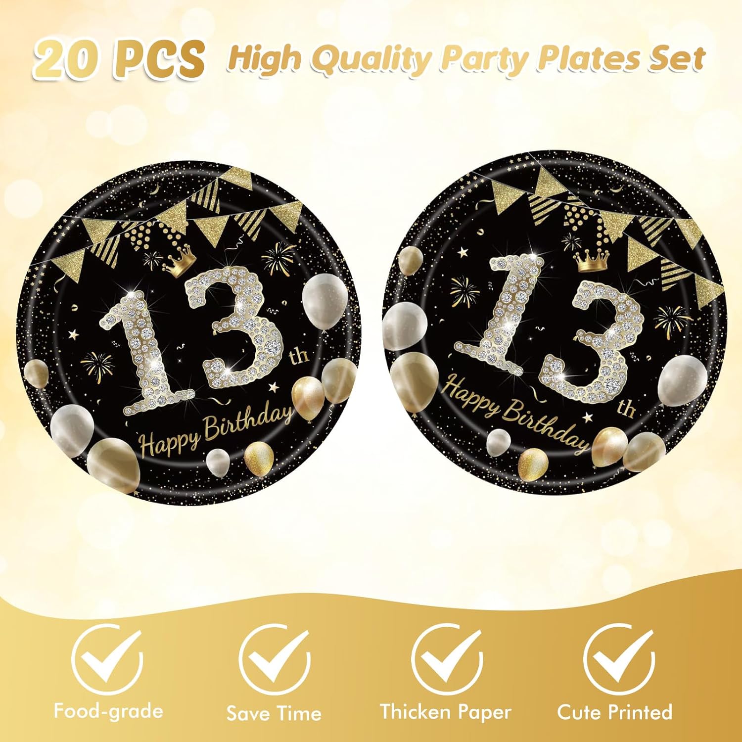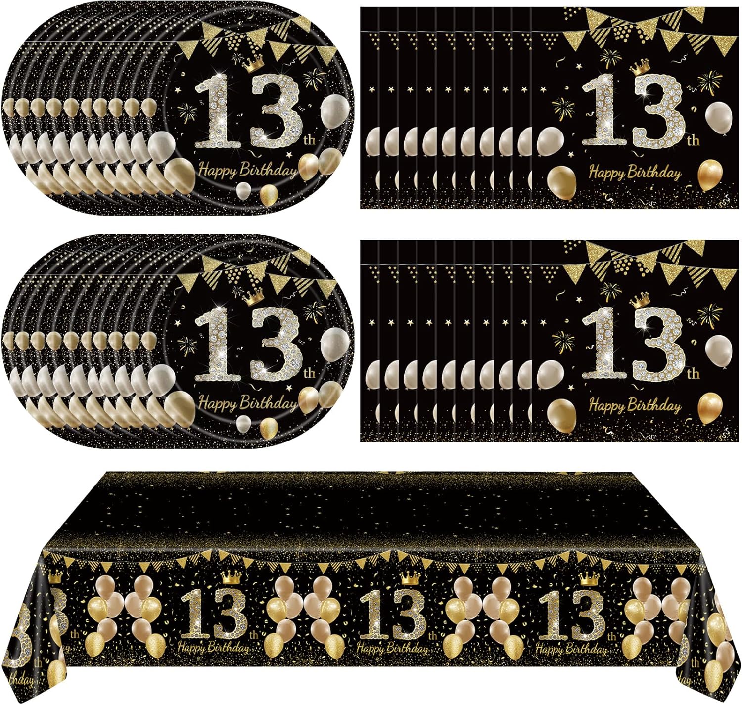 41Pcs 13th Birthday Decorations for Boy Girls, Black Gold 13 Year Old Tableware Decorations include Happy Birthday Plates Napkins Tablecloth for Official Teenager 13th Birth Party Favor