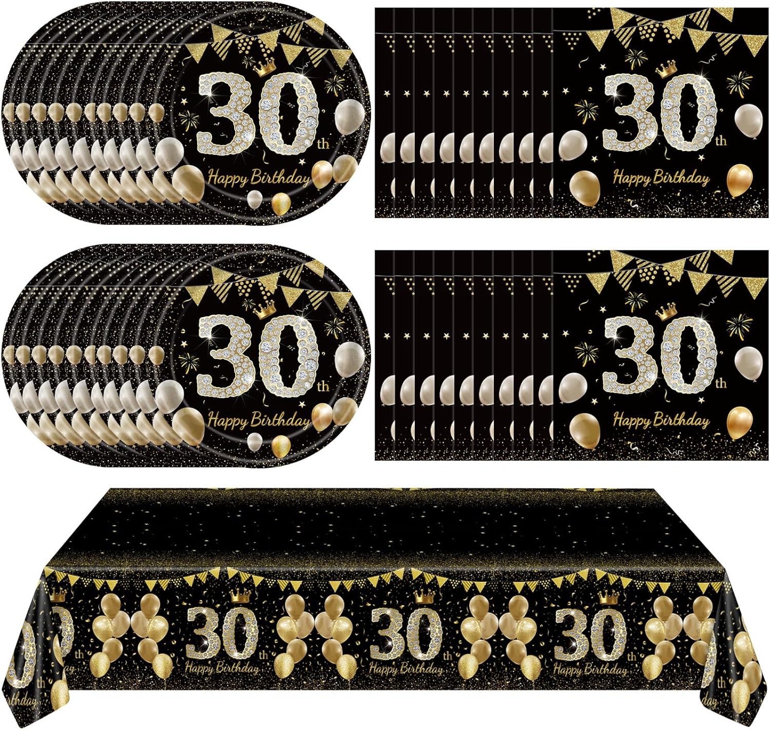 41Pcs 30th Birthday Decorations for Men Women, Black Gold 30 Year Old Birthday Party Supplies Include 20 Plates 20 Napkins and 1 Tablecloth, Black Gold 30 Aged Birth Party Tableware