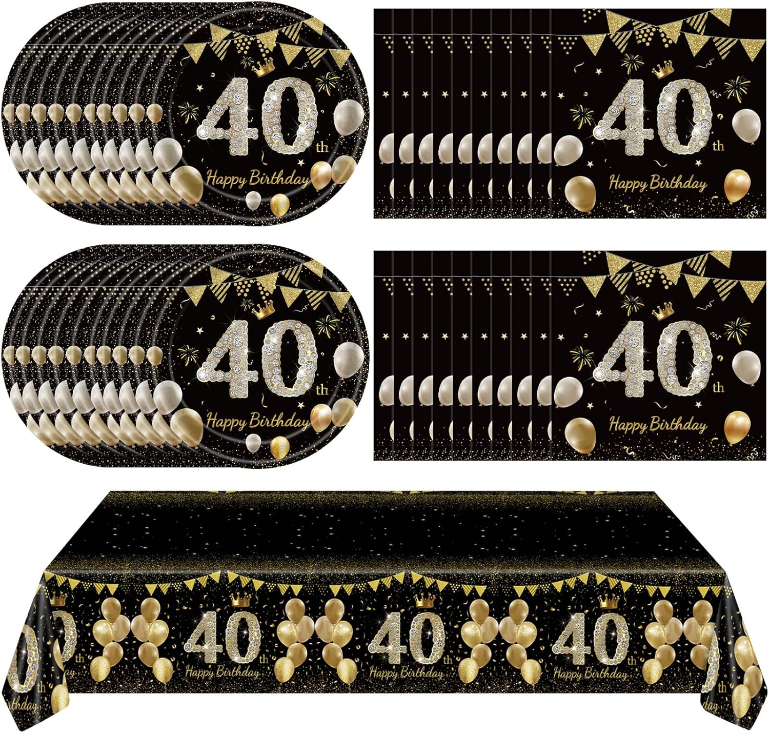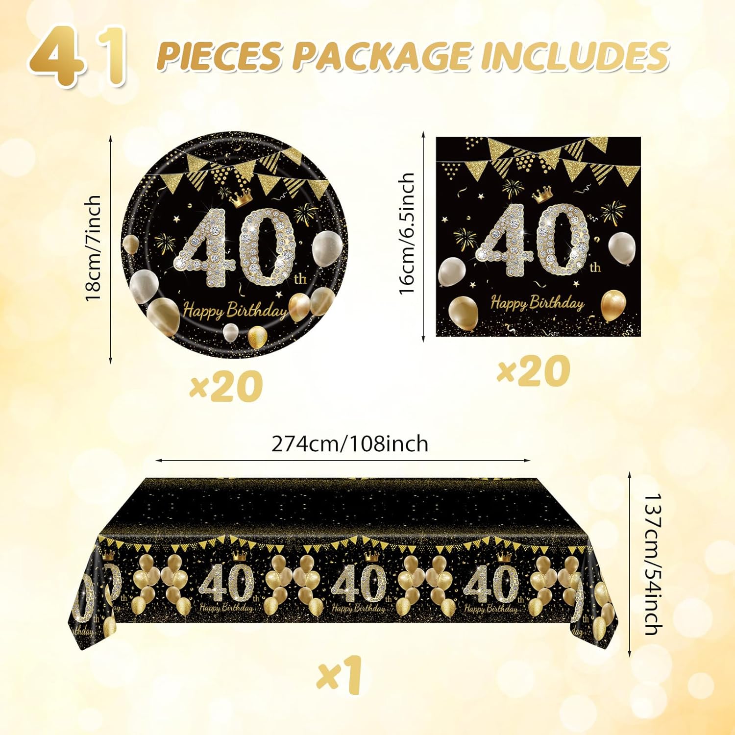 41Pcs 40th Birthday Decorations for Men Women, Black Gold 40 Year Old Birthday Party Supplies Include 20 Plates 20 Napkins and 1 Tablecloth, Black Gold 40 Aged Birth Party Tableware