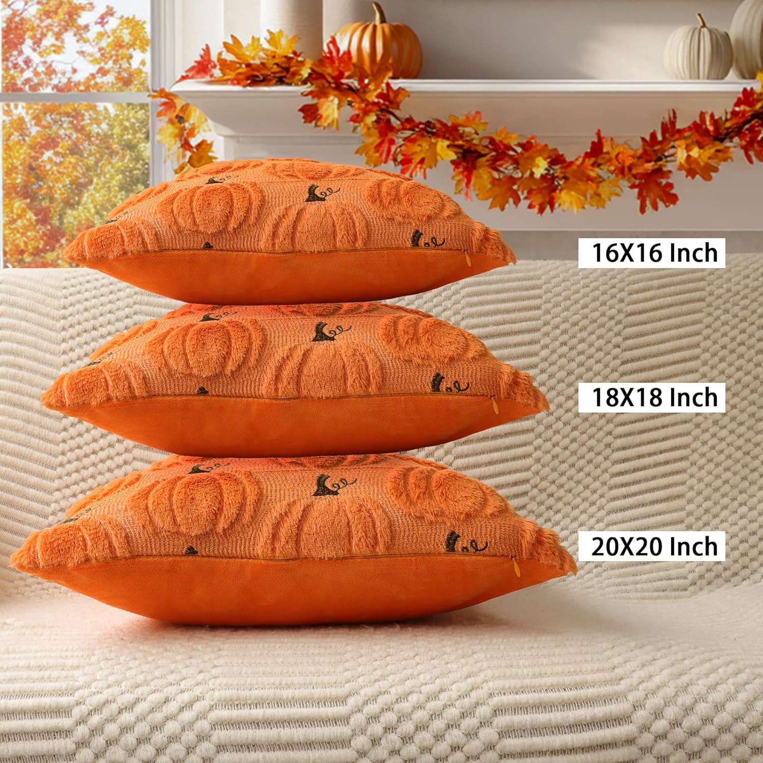 4TH Emotion Fall Pumpkin Decorative Pillow Covers 16x16 Set of 2, Orange Soft Plush Faux Fur Wool Farmhouse Throw Cushion Cases for Autumn Thanksgiving Holiday Home Decorations