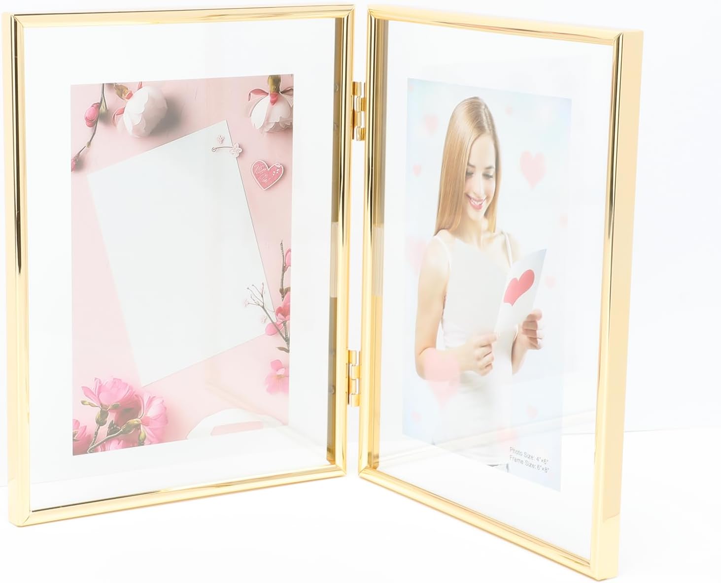 6"×8" Folding Double Frame, Gold Floating Picture Frame with Hinge, For 6"×8" 5"×7" 4"×6", Vertical, Tabletop Use, Classy For Anniversary, Wedding, Birthday