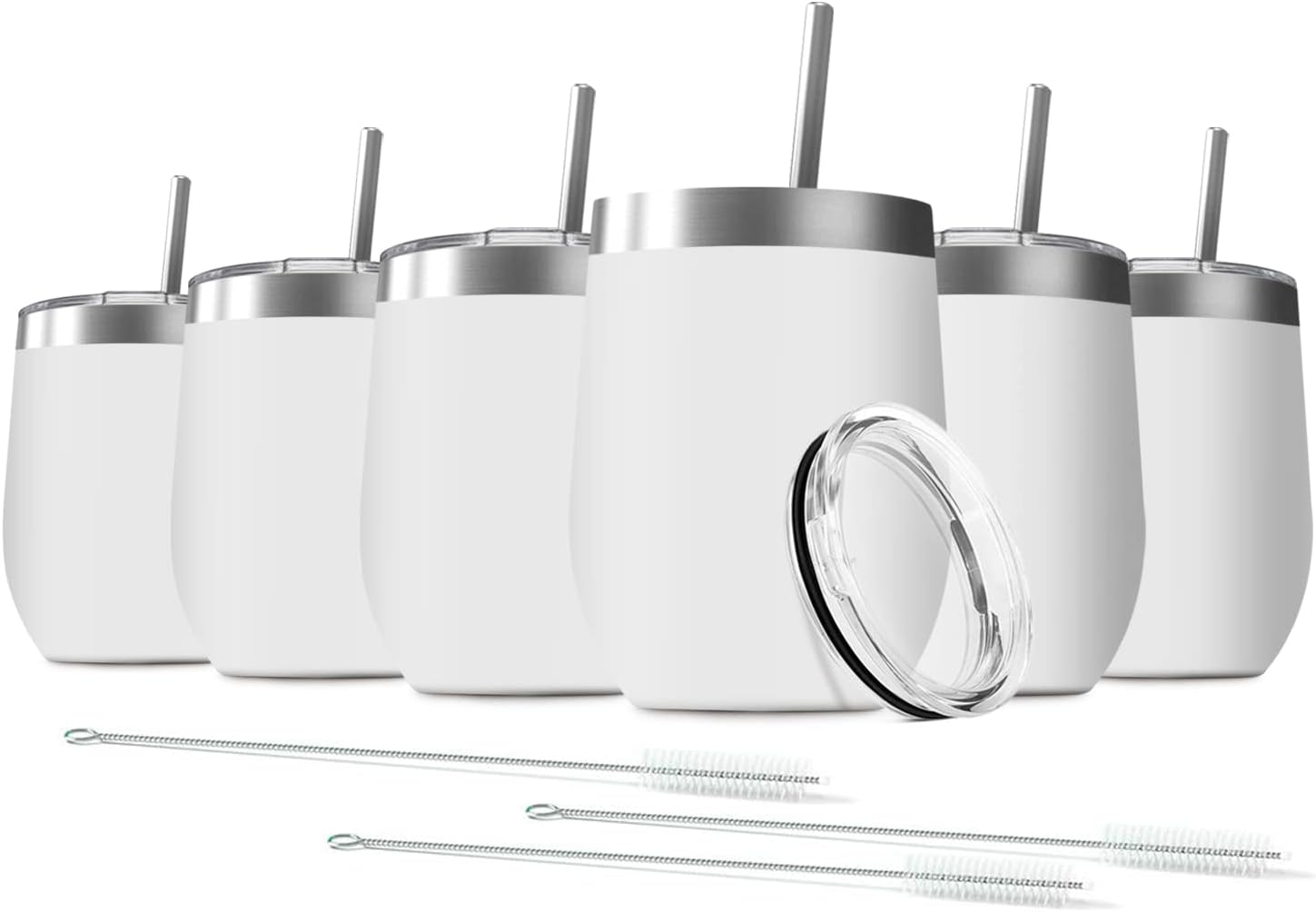 6 Pack 12 oz Stainless Steel Stemless Wine Tumbler with Leakproof Lids, Double Wall Vacuum Insulated Travel Cup Including 6 Straws set,for Coffee, Cocktail, Drink, Tea and Beer (White