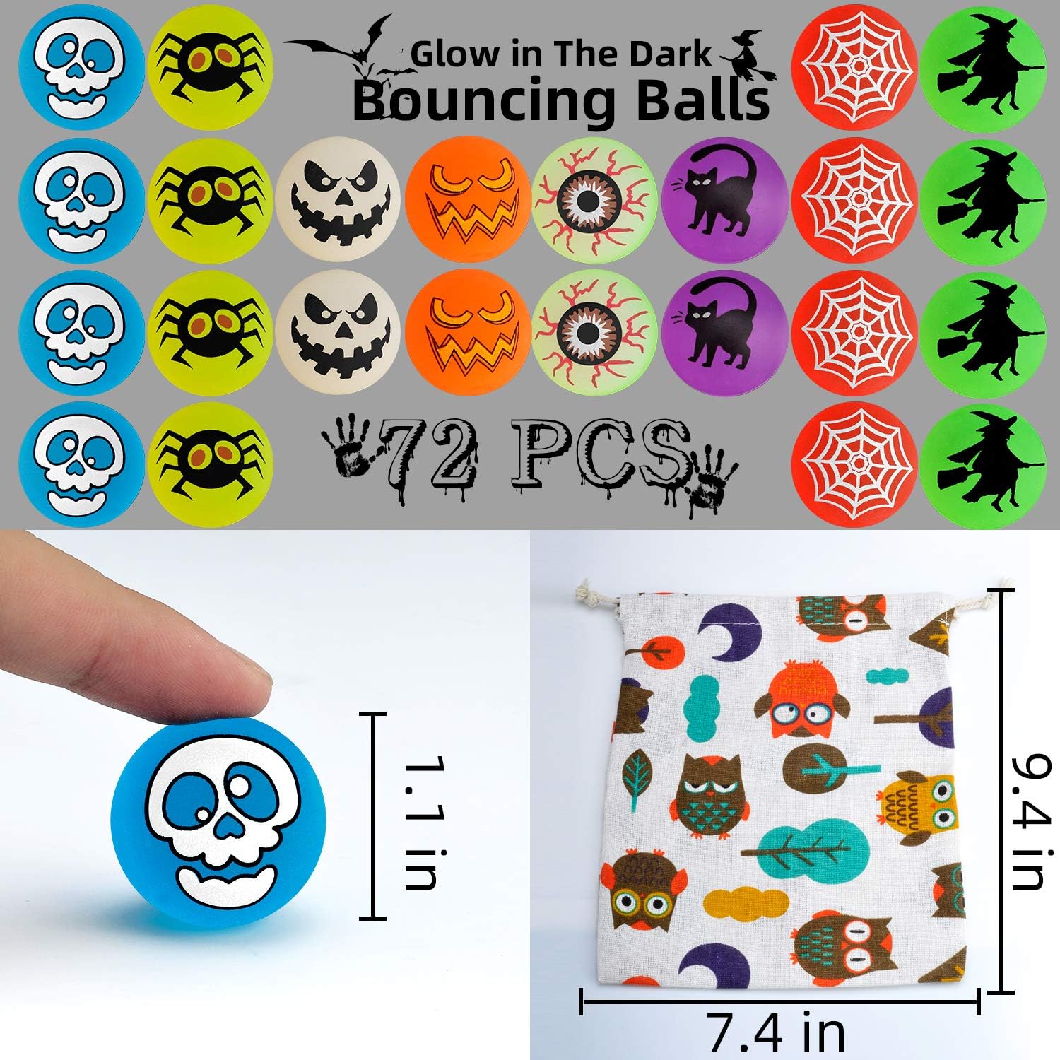 72 Glow in The Dark Bouncing Balls,8 Halloween Theme Designs for Halloween Party Favor Supplies, School Classroom Game Rewards, Trick or Treating Goodie, Halloween Miniatures/Prizes(with pouch bag)