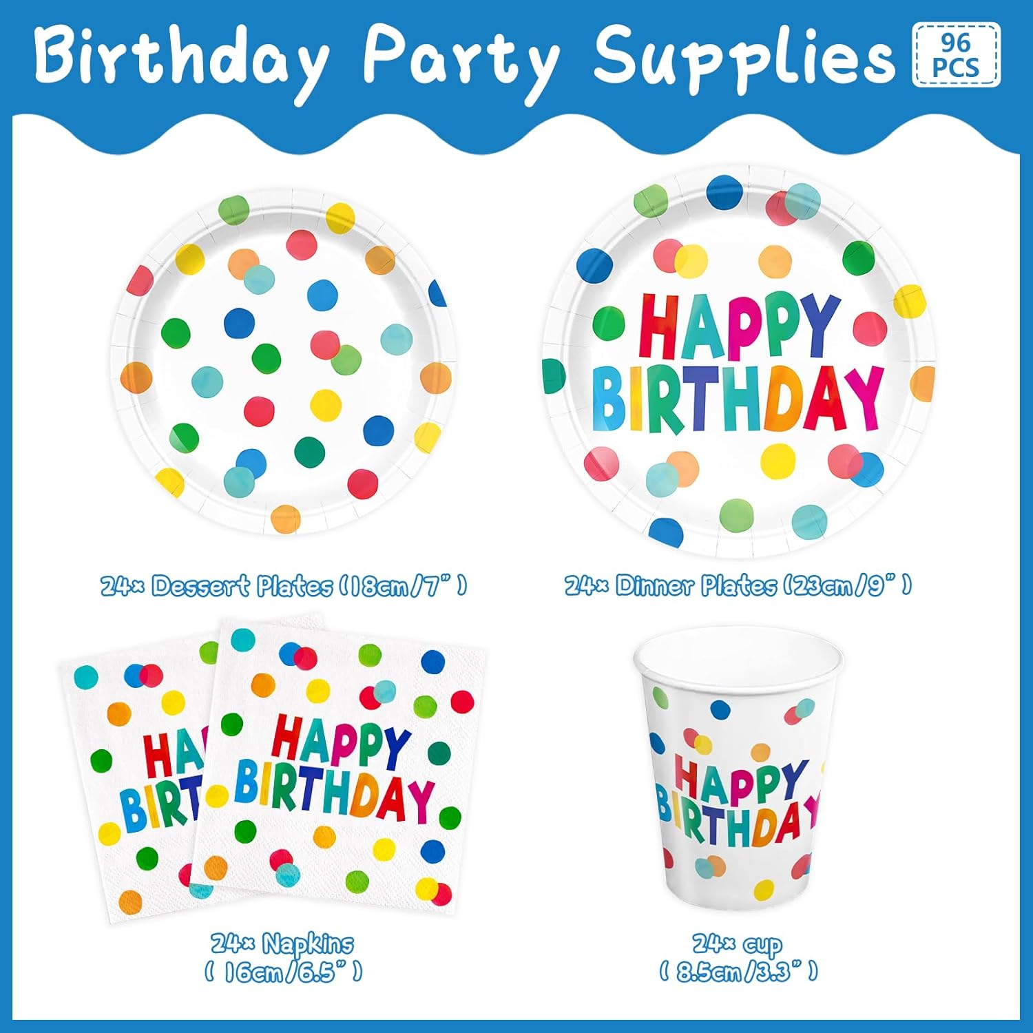 96pcs Happy Birthday Party Plates and Napkins Polka Dots Birthday Party Supplies Colorful Dots Paper Cup Party Supplies for Girls Boys Serve 24 Guests