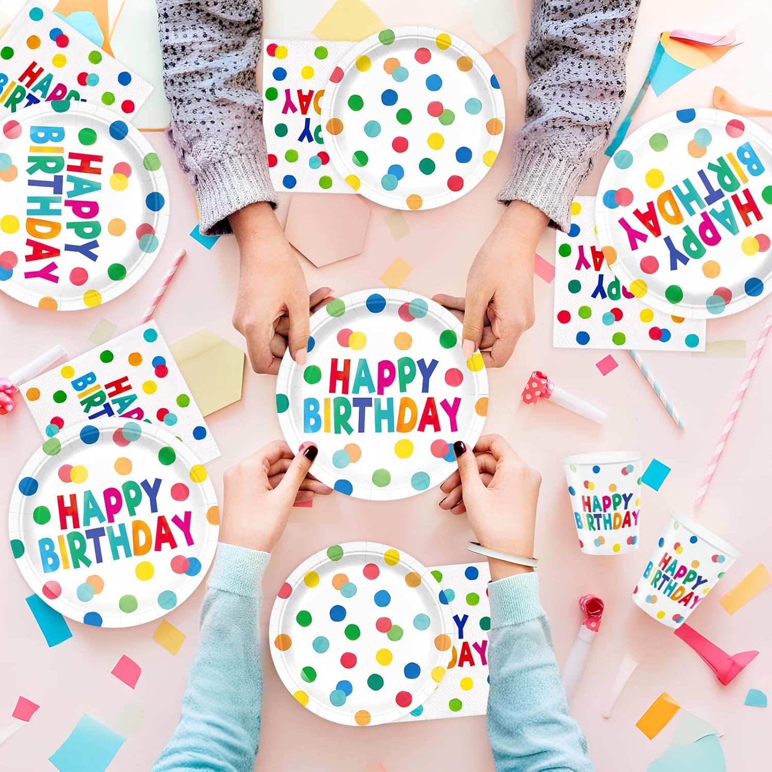 【Polka Dots Design】 Happy birthday party supplies feature a colorful “Happy Birthday” headline printed onto a multicolored dotted background that is made to attract and please your guests.