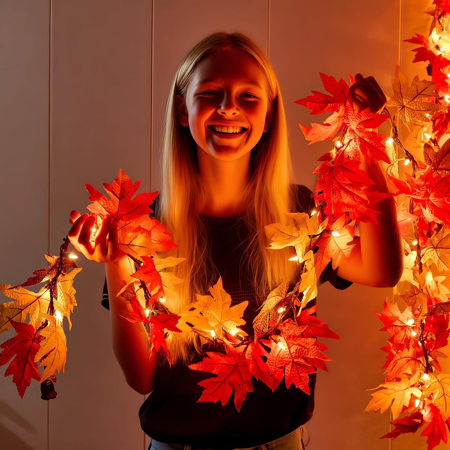 9FT Fall Decorations for Home Large Leaves Fall Garland with Lights Plug in 50 Bulbs Connectable Thanksgiving Garland String Lights for Outdoor Indoor Harvest Fireplace Fall Decor(2 Packs)