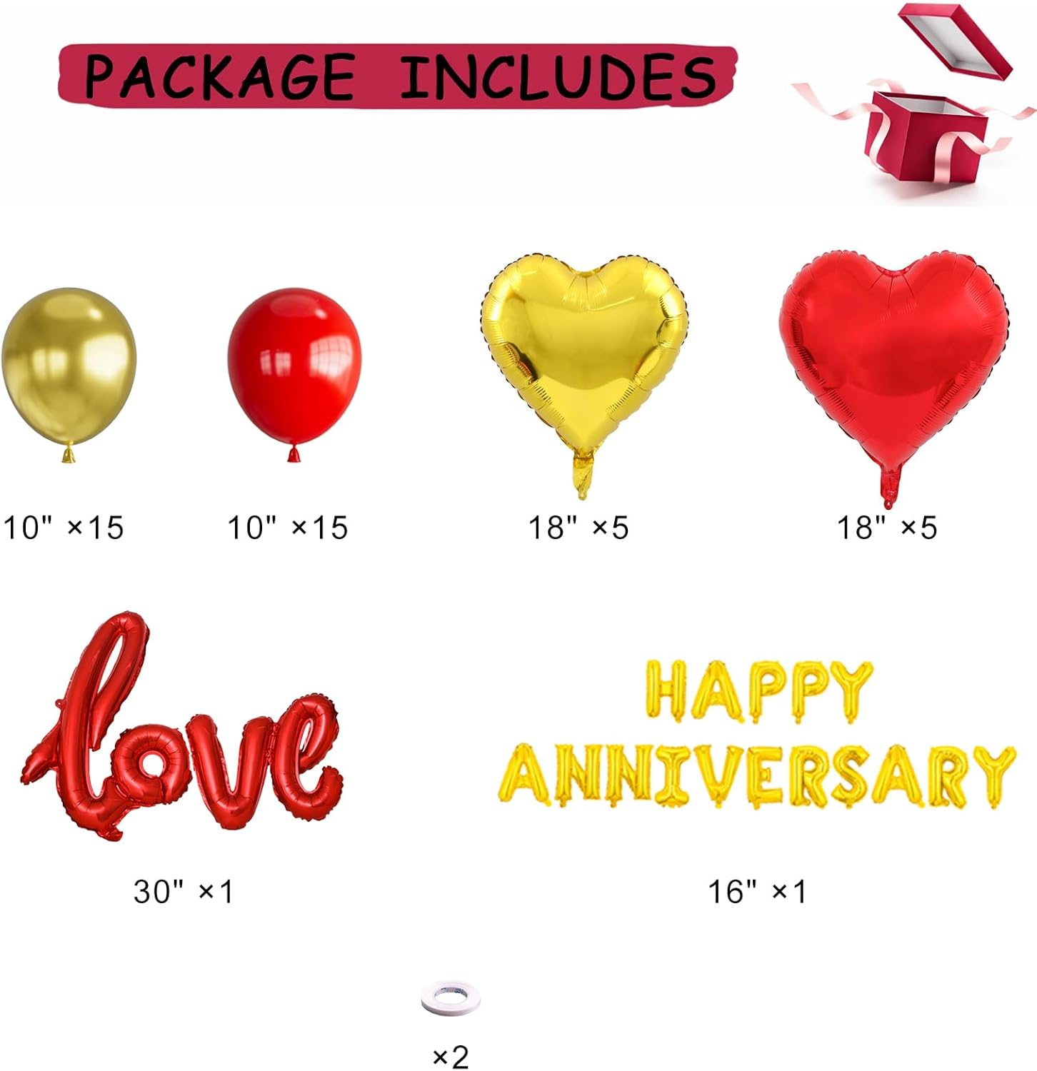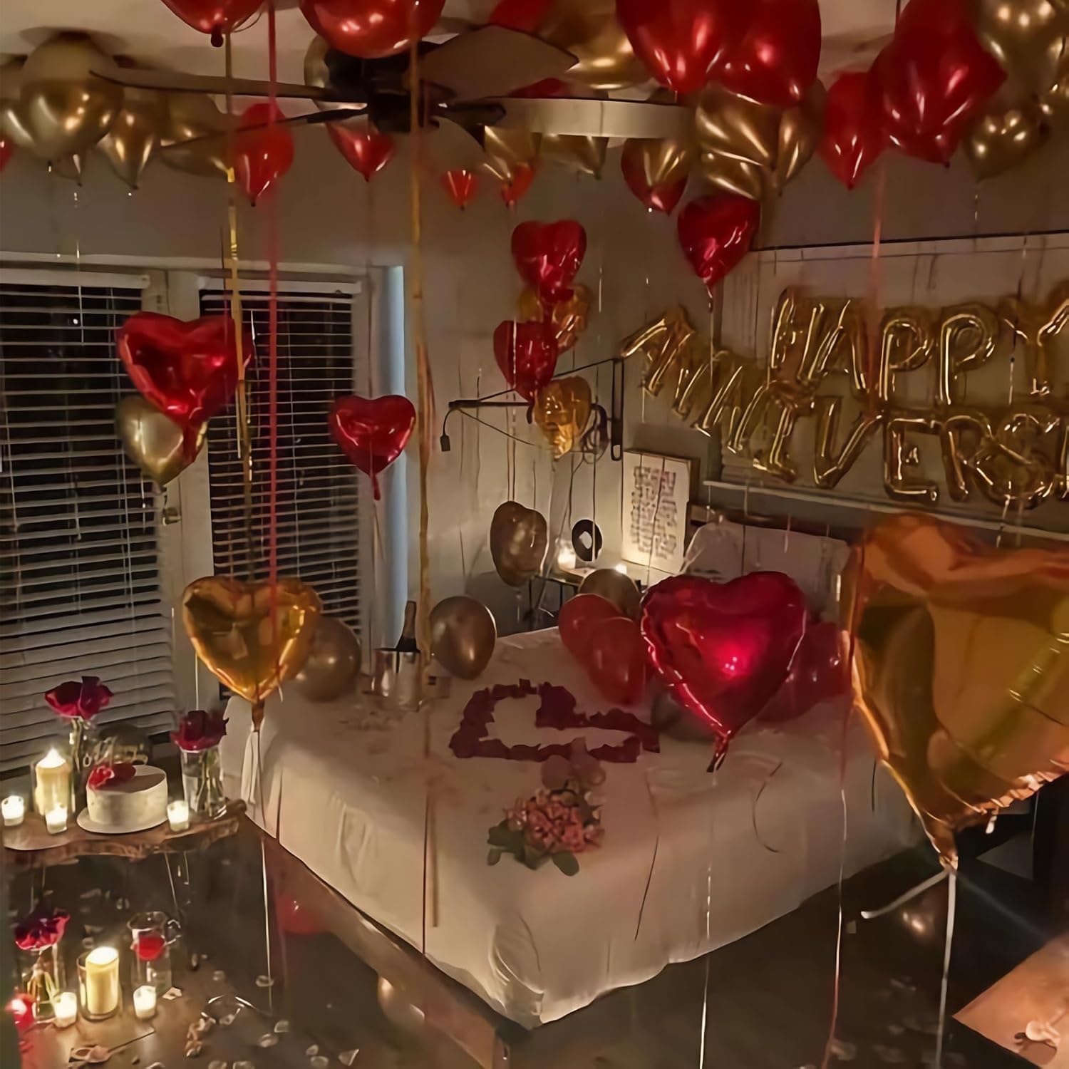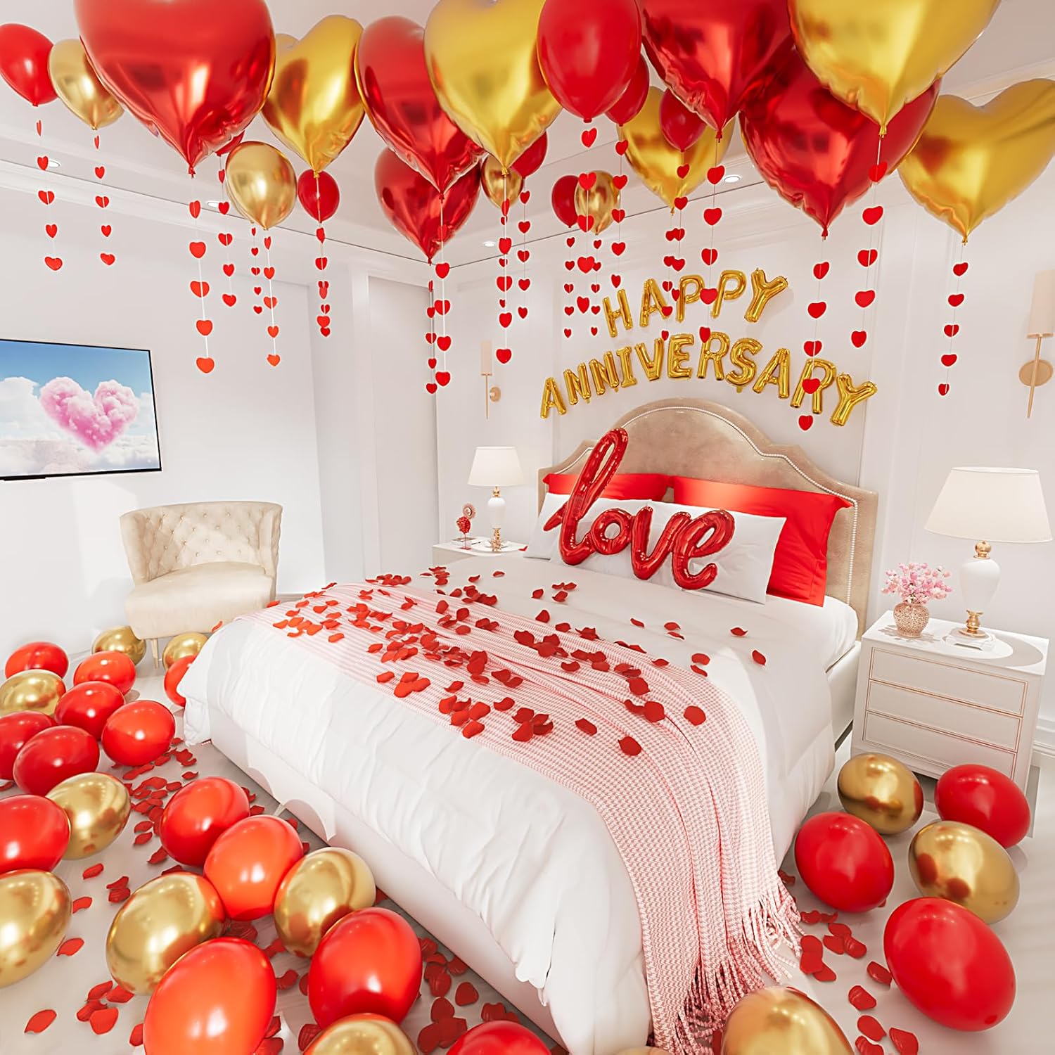 Perfect Decorations for Anniversary - This anniversary decorations kit inclueds (16"happy anniversary banner, red hanging string hearts, latex red balloons×15, latex gold balloons×15, red foil heart balloons×5, gold foil heart balloons×5, Love balloon×1, Red Silk Rose Petals×1000). This anniversary decorations kit will make a unique and luxurious anniversary party