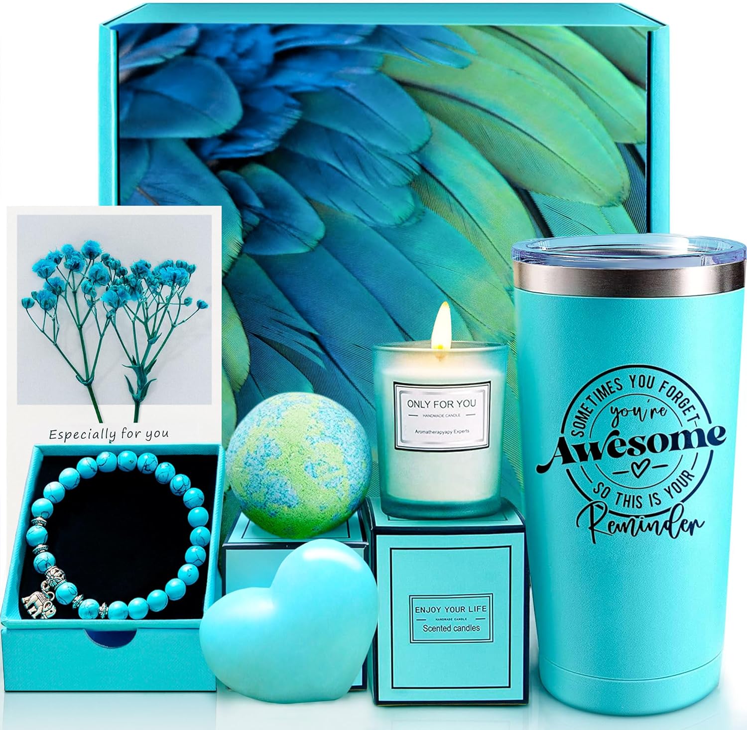 Spa Gift Basket Set: Includes a 20oz insulated tumbler, turquoise bracelet, gardenia-scented candle, heart-shaped handmade soap, bath bomb, bath salt, and a special message card. The turquoise bracelet is symbolizes protection and good fortune. An unforgettable unboxing experience that makes a stunning first impression. Ideal happy birthday gifts, Christmas gifts for women, employee appreciation gifts, teacher appreciation gifts, thank you gifts , thinking of you gifts