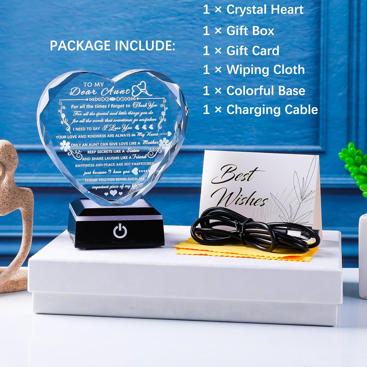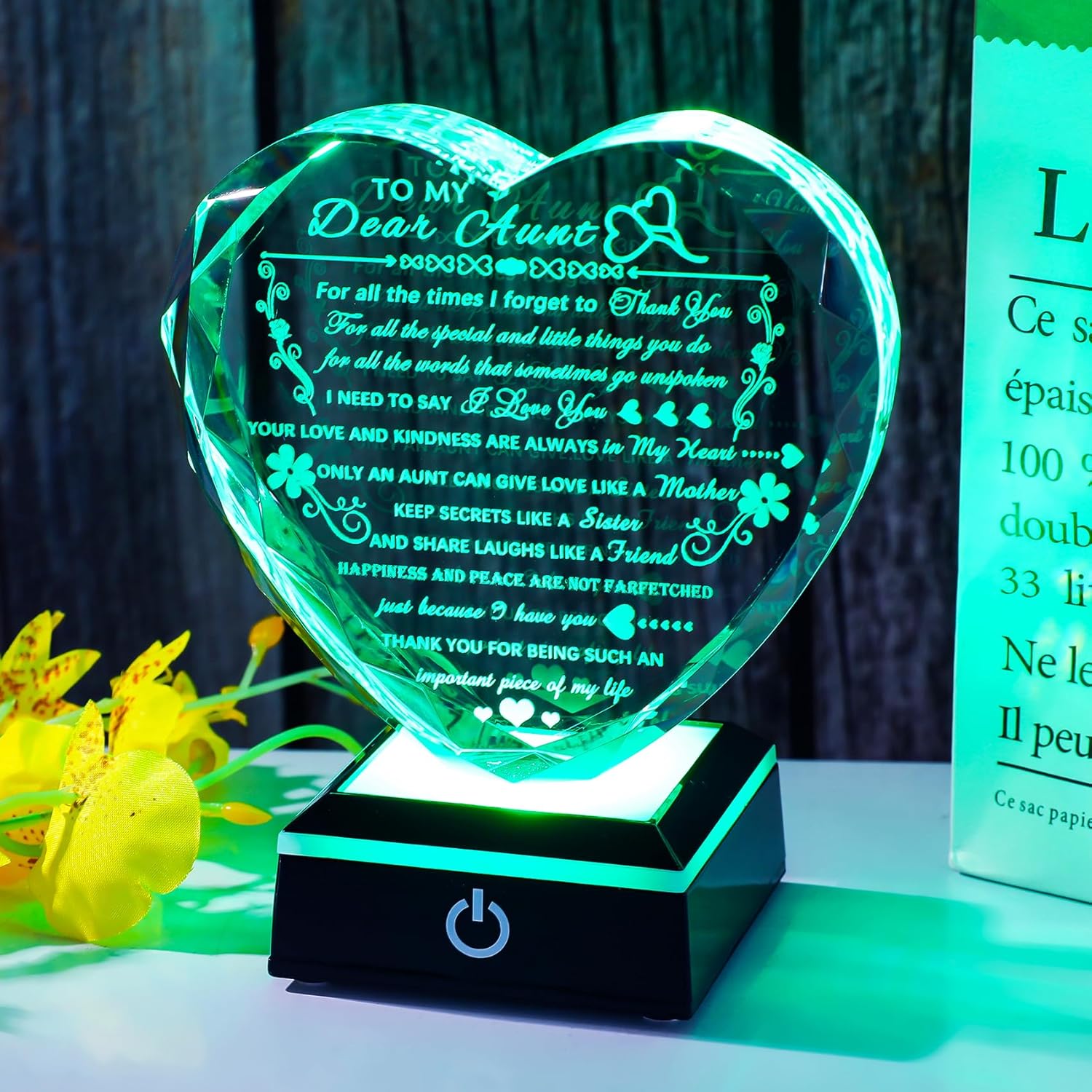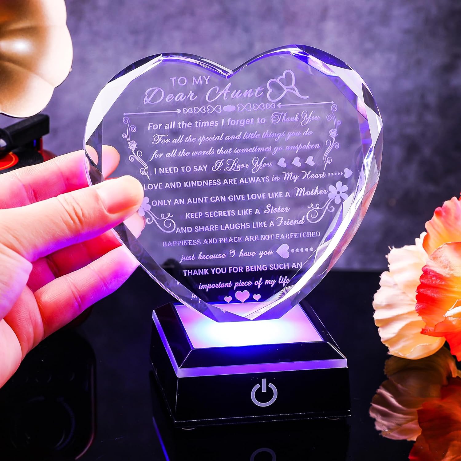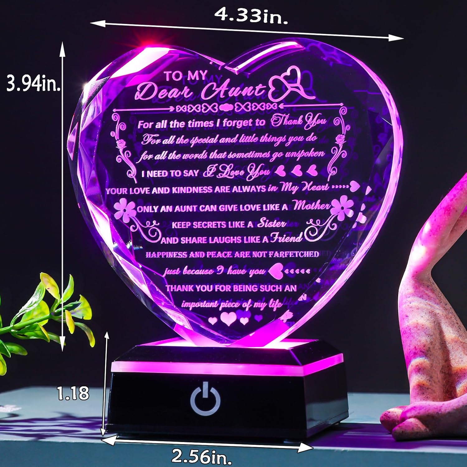 Aunt Gifts with Colorful LED Base Meaningful Crystal Heart Aunt Birthday Gifts from Niece Nephew Unique Presents for Auntie Christmas Mother's Day Valentine Day Thanksgiving