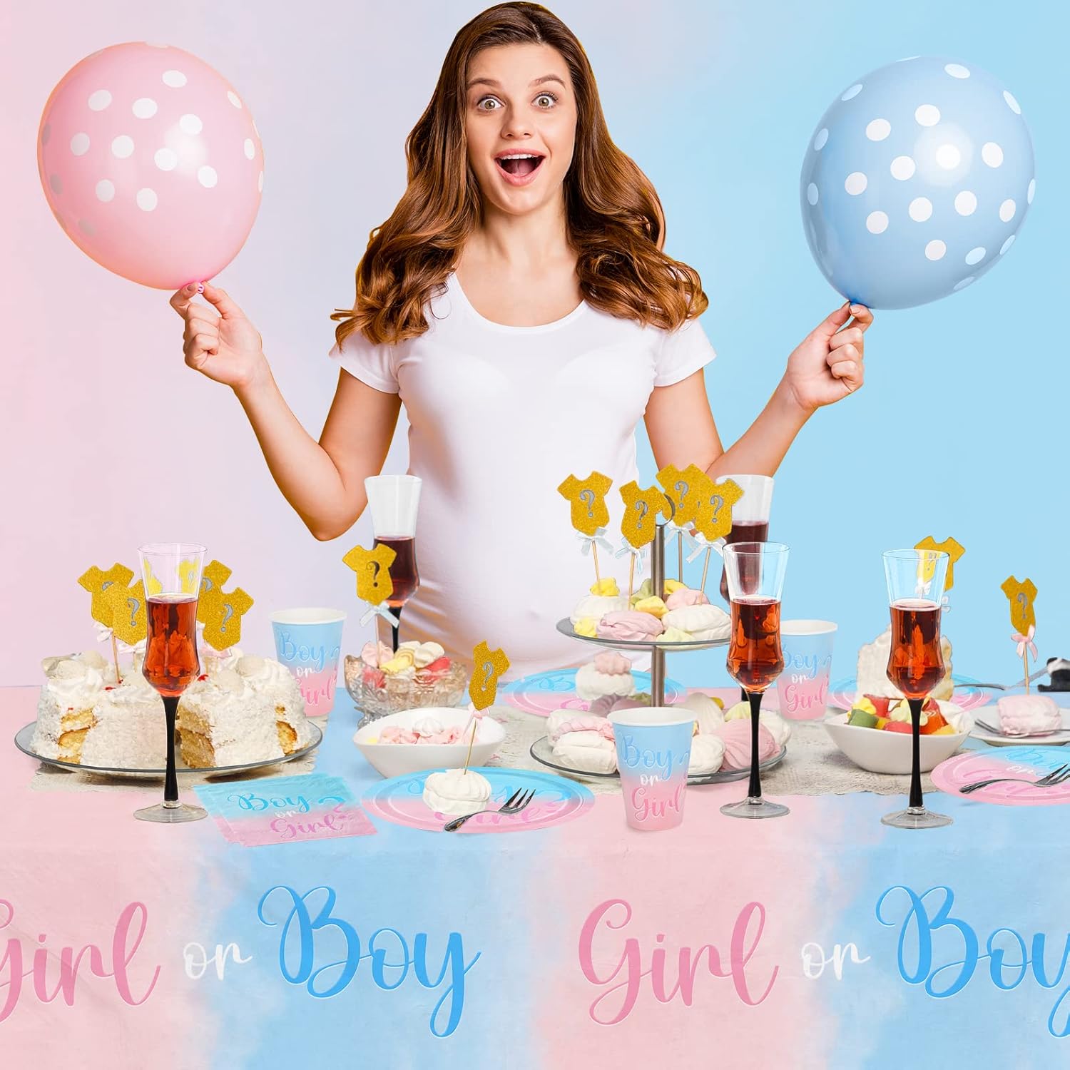 Baby Gender Reveal Party Supplies, Boy or Girl Disposable Paper Plates Napkins Cups Tablecloth for Baby Shower Decorations, Serve 25
