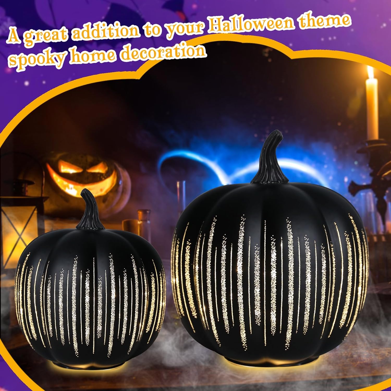 Bdor Halloween Pumpkin Decorations, 2-Piece LED Black Pumpkins Set with Gold Stripes, 8.66" & 6.69" Light Up Fall Decor for Tabletop, Home, Party