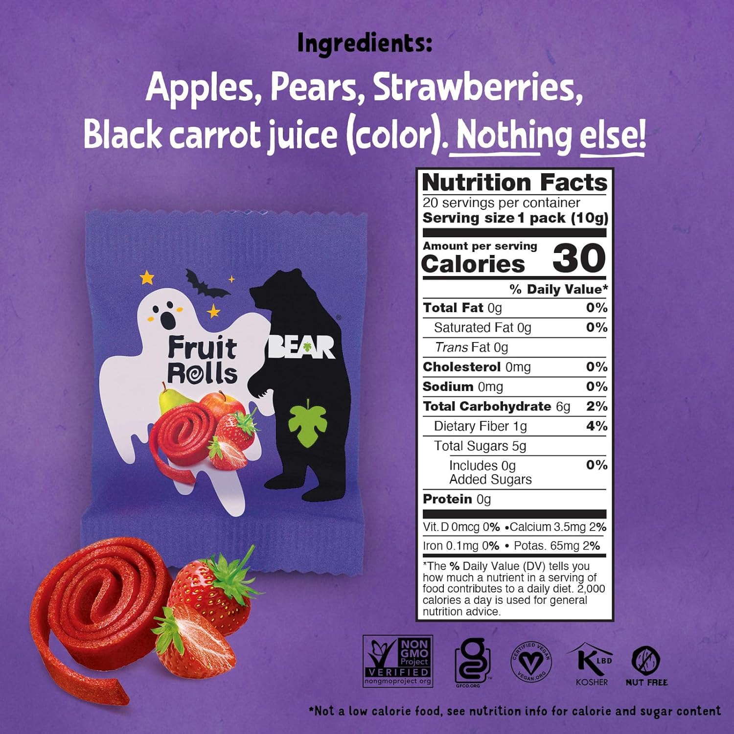 BEAR Real Fruit Snack Rolls - Gluten Free, Vegan, and Non-GMO - Strawberry – Halloween Pack - Healthy School And Lunch Snacks For Kids And Adults, 0.34 Ounce (Pack of 20)