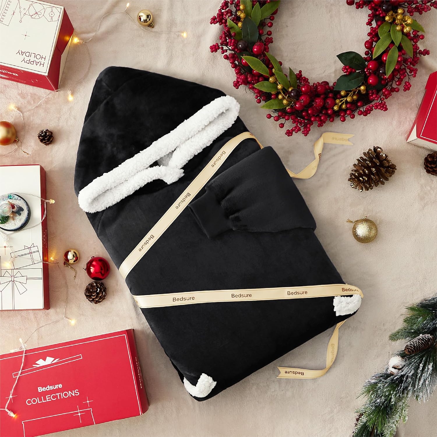 Bedsure Blanket Hoodie, Wearable Blanket for Adults & Kids as Gifts for Women Men, Birthday Gifts for Women Mom Girl Sherpa Oversized Hoodie, Black, Small
