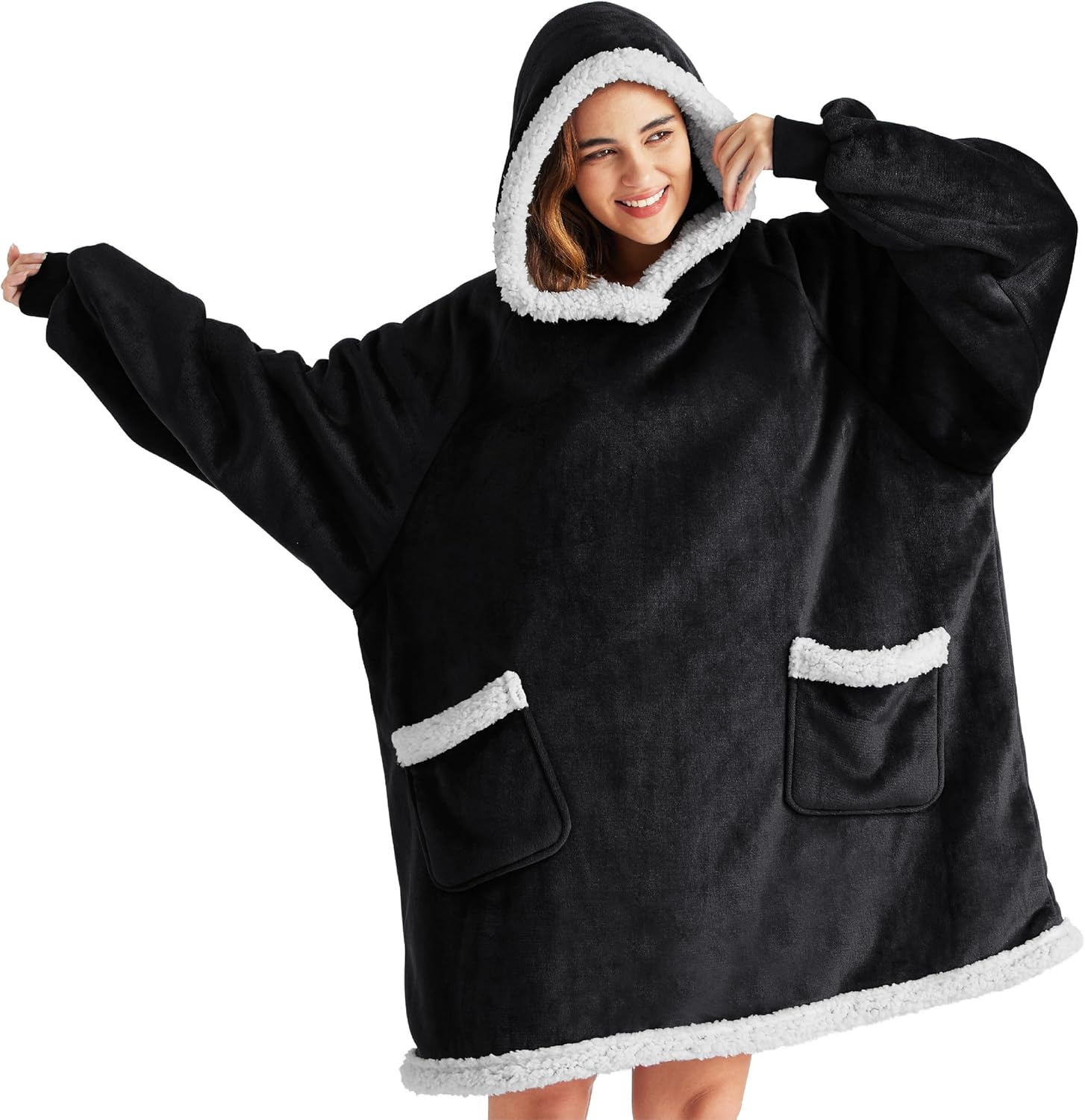 Bedsure Blanket Hoodie, Wearable Blanket for Adults & Kids as Gifts for Women Men, Birthday Gifts for Women Mom Girl Sherpa Oversized Hoodie, Black, Standard