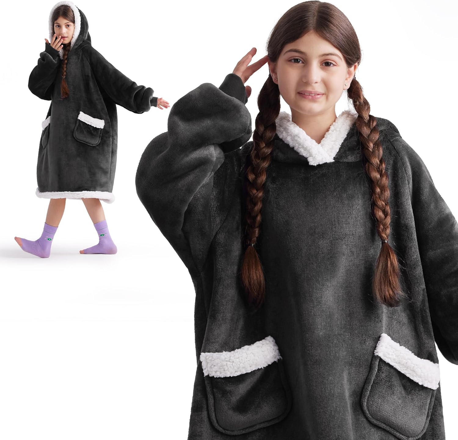 Bedsure Blanket Hoodie, Wearable Blanket for Adults & Kids as Gifts for Women Men, Birthday Gifts for Women Mom Girl Sherpa Oversized Hoodie, Grey Black, Kids