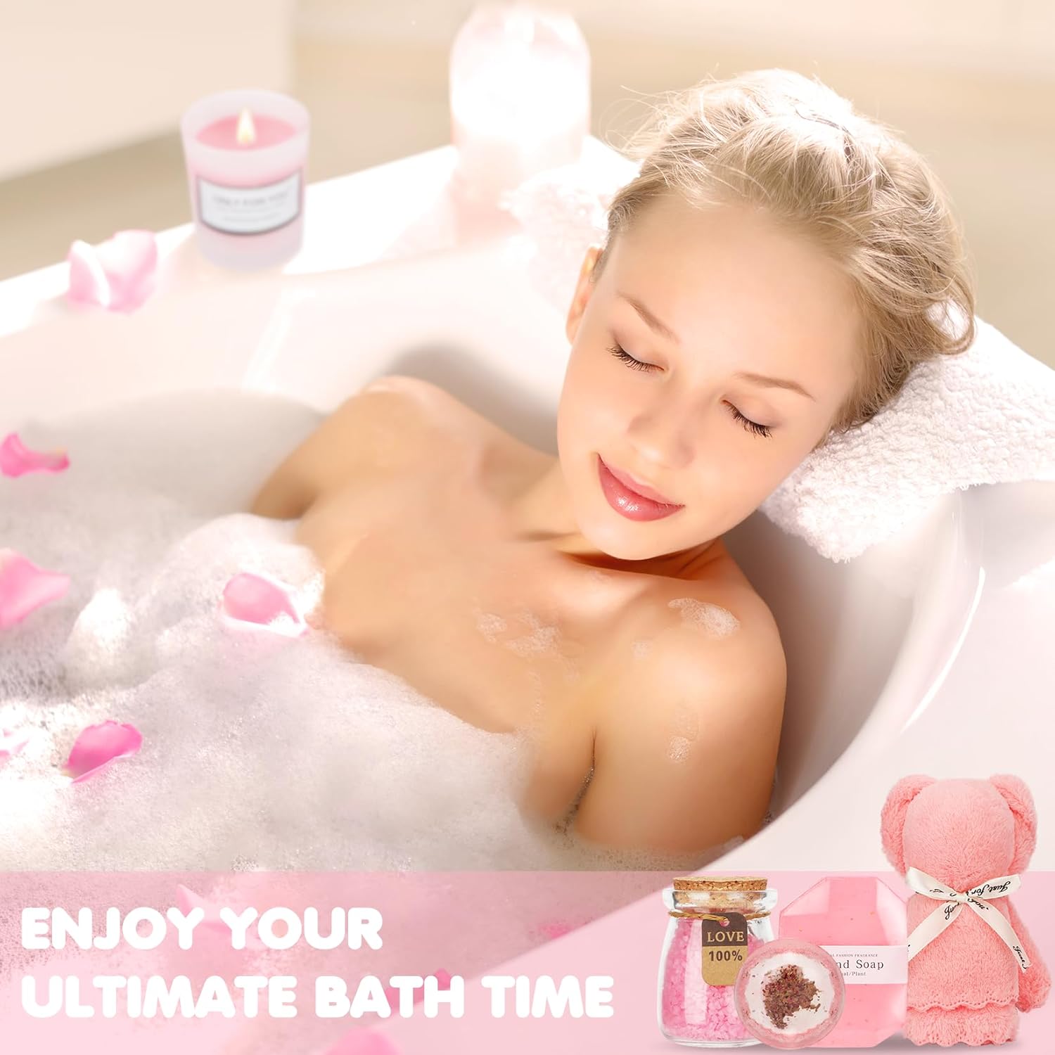ROSE-SCENTED RELAXING SPA GIFTS BASKET: This rose-scented candle is made from pure essential oils and 100% natural soy wax, burning smokelessly and evenly for up to 50 hours. Paired with handmade soap, bath bombs, and bath salts, all infused with the enchanting scent of roses, it offers a luxurious spa experience. These products help you relieve stress and soothe fatigue, making your bathing time a moment of ultimate relaxation and comfort.