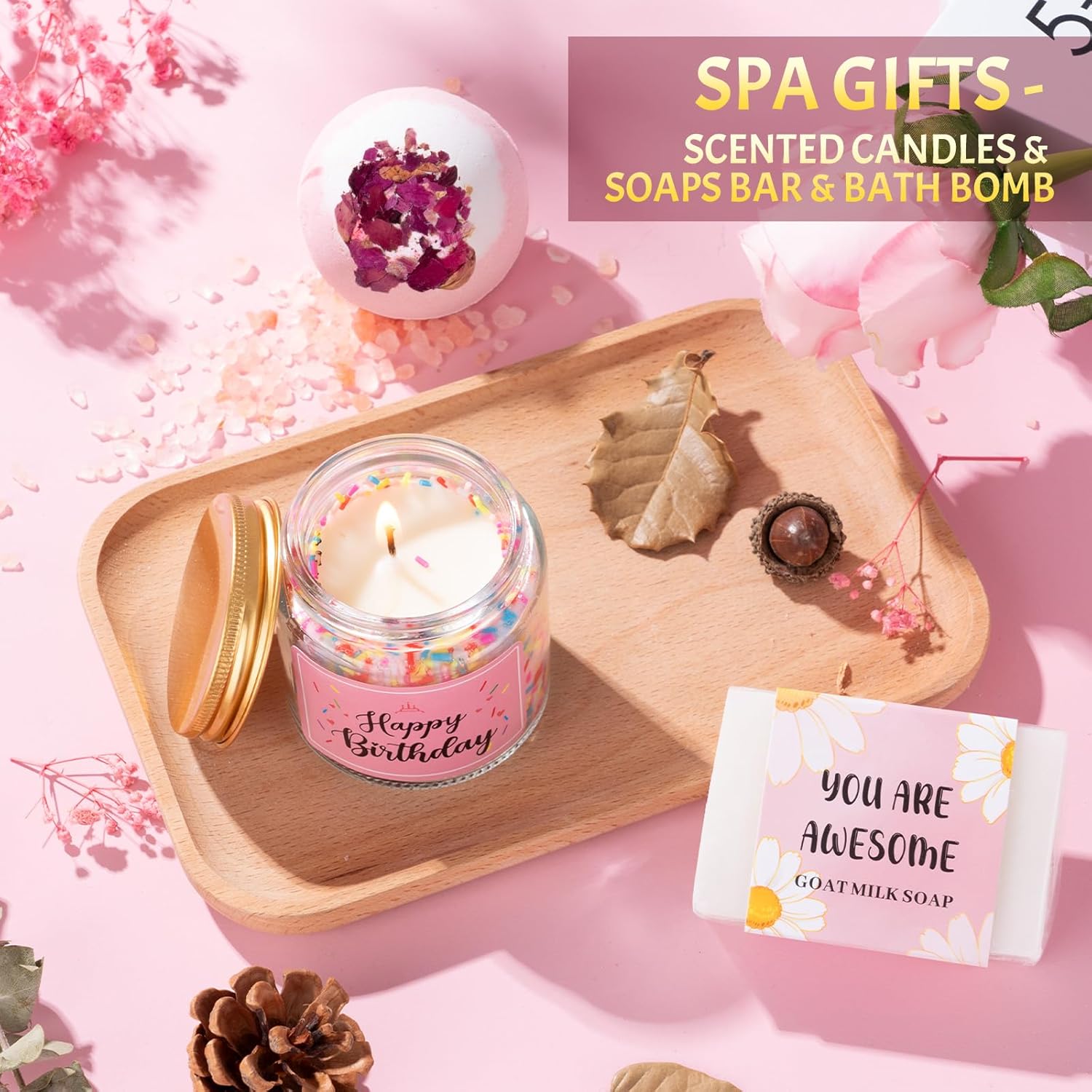 【RELAXING BIRTHDAY SPA GIFT BASKET】Every age deserves a celebration - We’ve included rose bath bombs, creamy goat milk soap, a rose scented candle, silky eye mask, and ultra-soft fuzzy socks to create the ultimate at-home spa night. From head to toe, she’ll feel pampered, relaxed, and maybe even a little spoiled (as she should!). Because self-care shouldn’t be complicated—it should feel this good. A unique birthday gifts for women—relaxing, thoughtful, and unforgettable.