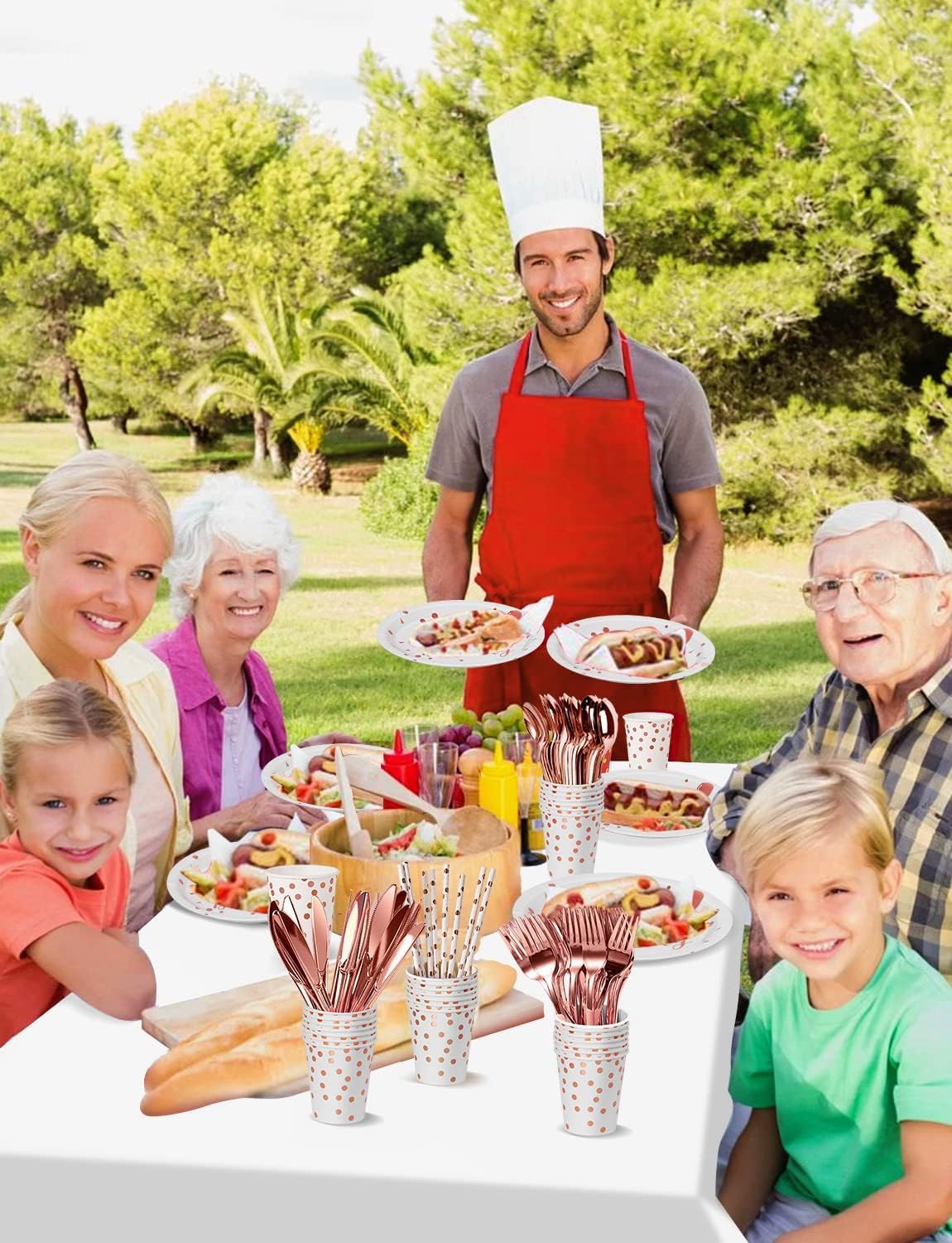 【Serve 20 Guests in Style】This elegant party dinnerware set includes 20 pieces of 9" dinner plates, 20 pieces of 7" dessert plates, 20 pieces of 9oz cups, 20 luncheon napkins (3-ply, 6.5" x 6.5"), and 20 sets heavy-duty rose gold plastic utensils (20 forks, 20 spoons, 20 knives) and 1 sheet tablecloth to complete your table setting.