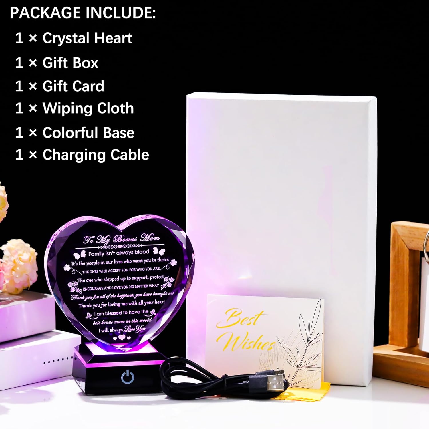 Bonus Mom Gifts with Colorful LED Base Crystal Heart Mothers Day Birthday Gifts for Stepmother Bonus Mom from Bonus Daughter Son Gift for Stepmom Mother in Law on Christmas Valentines