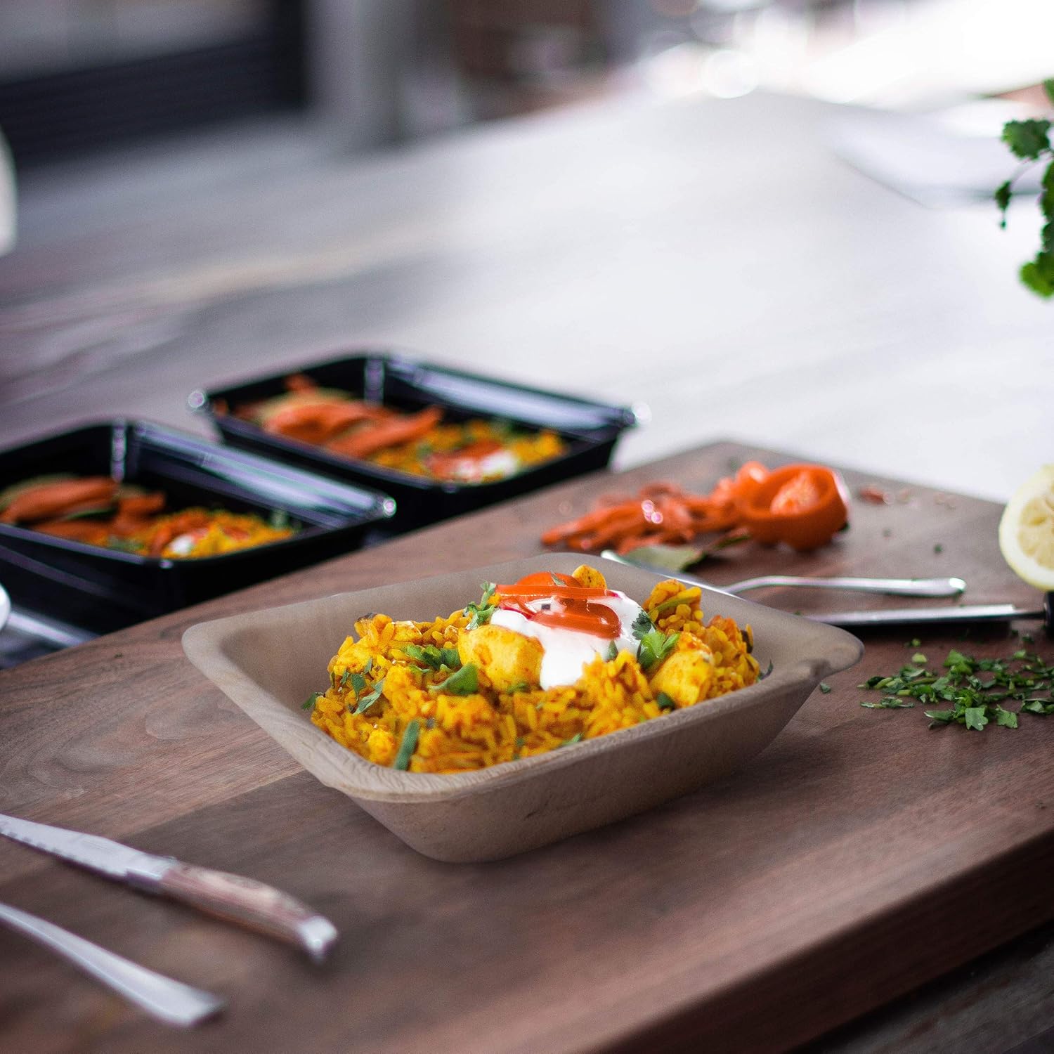 Party Elegance: Elevate your celebrations with Chic Leaf palm leaf bowls, the perfect complement to party gatherings. These square disposable bowls provide an eco-friendly, stylish alternative to traditional party plates