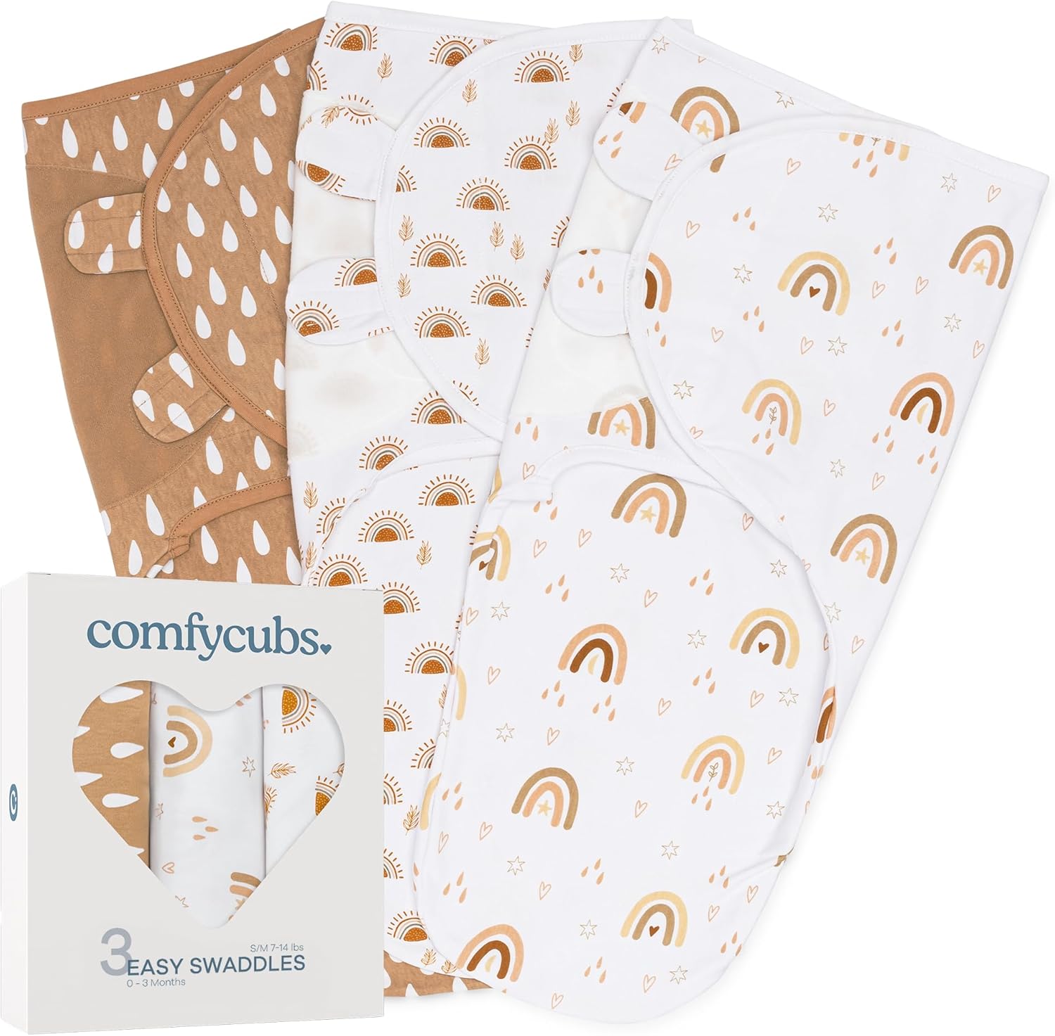 Comfy Cubs Easy Swaddle Blanket, 3 Pack - 100% Cotton Newborn Wrap, Small for 0-3 Months Infants, with Adjustable Velcro, Breathable and Durable Sleep Sack for Babies - Rainbow Bohemian
