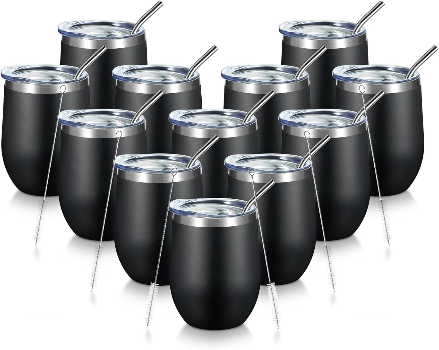 COMOOO 12oz Stainless Steel Wine Tumbler with Lid and Straw, Double Wall Vacuum Insulated Wine Tumbler Cup, Stemless Wine Tumbler for Cold and Hot Drinks, Coffee, Wine, Cocktails, Black, 12 Pack