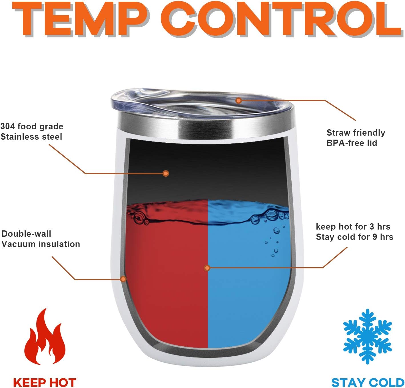 [Double Wall Vacuum Insulation]The 12 oz wine tumbler with double wall vacuum insulation technology is made of 304 food grade stainless steel. Keep your coffee wine or cocktail ice-cold for 9 hours or your coffee and tea scalding-hot for over 3 hours